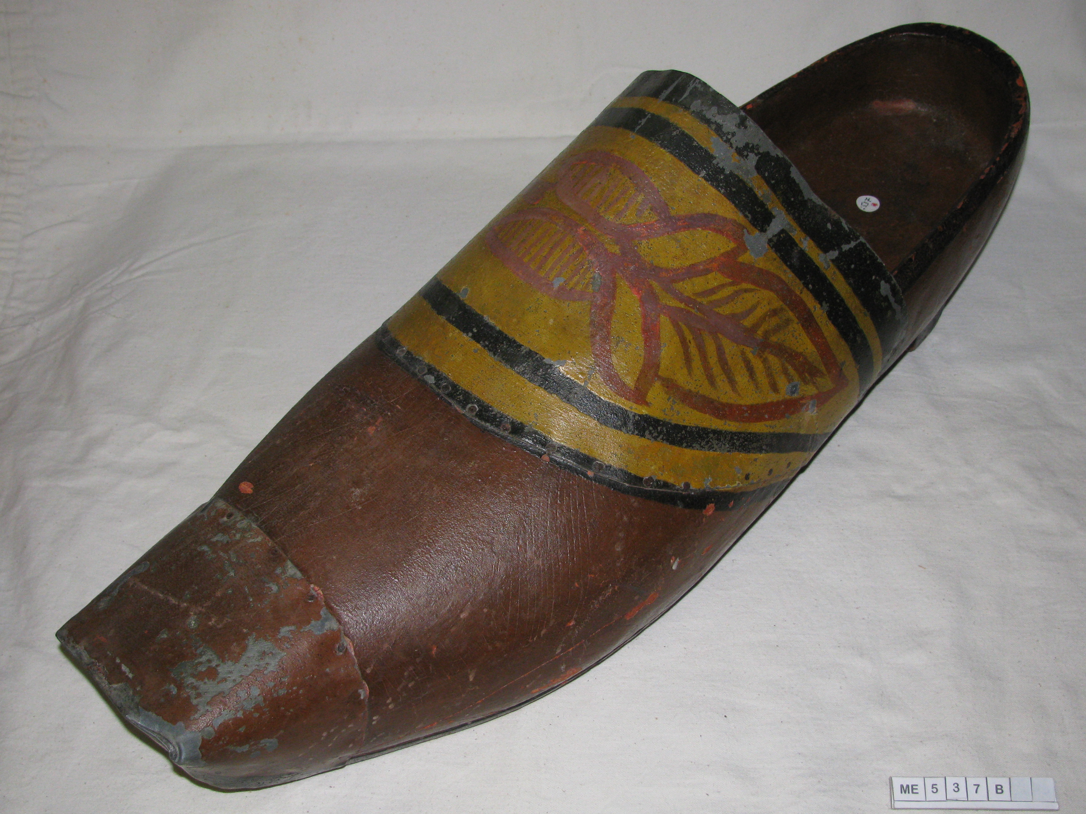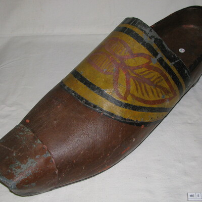 Uithangbord klomp, kapklomp, half bedekt. Hoge hak en brede met verf versierde blikken wreefband. Houten neus is beschadigd, daarom is deze van een blikken neus voorzien. Groot gat in de zool. Geel, bruin, rood, zwart.