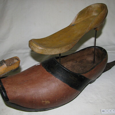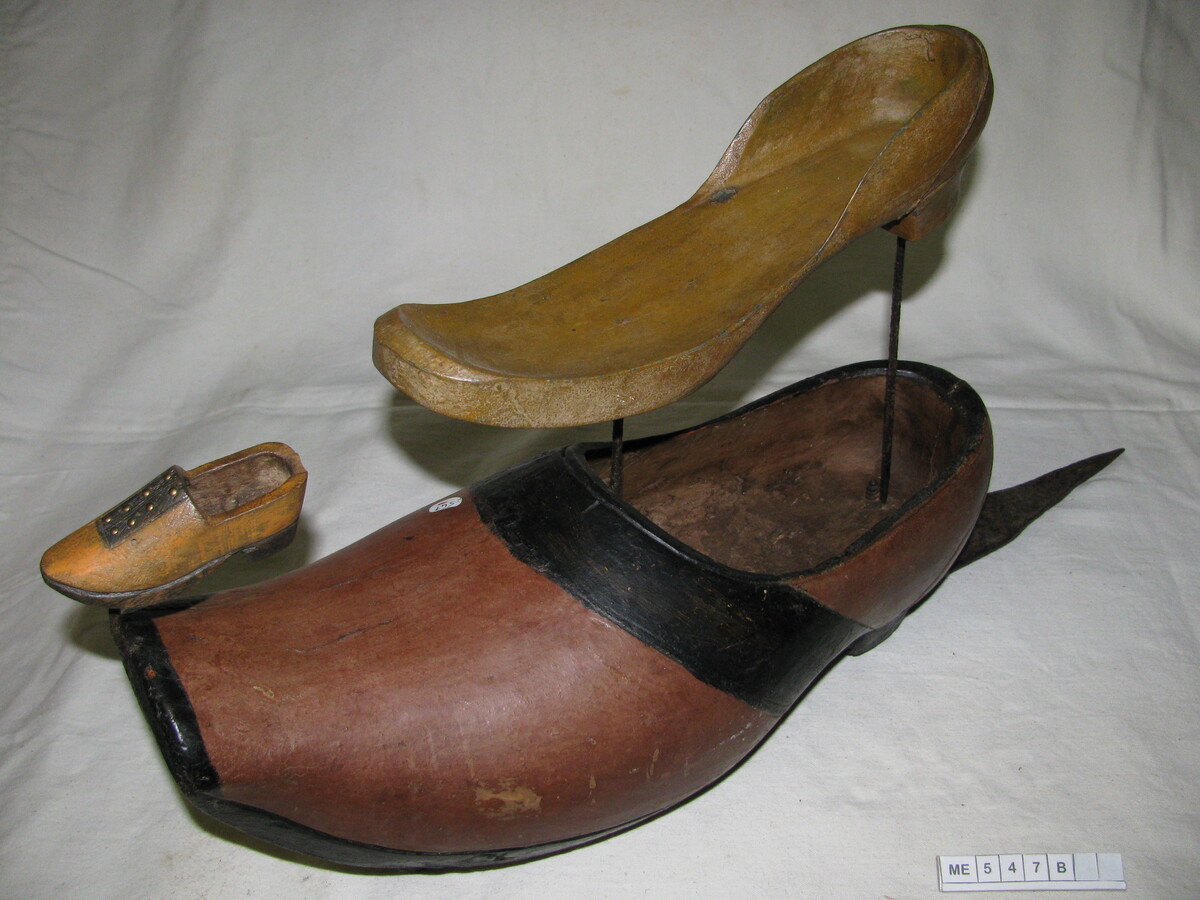 Uithanbord klompen, kapklomp. Met hoge hak en brede opgaande neus. Op de neus een klein kapklompje, met stampertje vast op de punt. In de instap 2 pinnen waarop een houten zool voor een galoche staat. Onder de klomp een ijzeren pen voor bevestiging aan de muur. Geel, zwart, bruin.