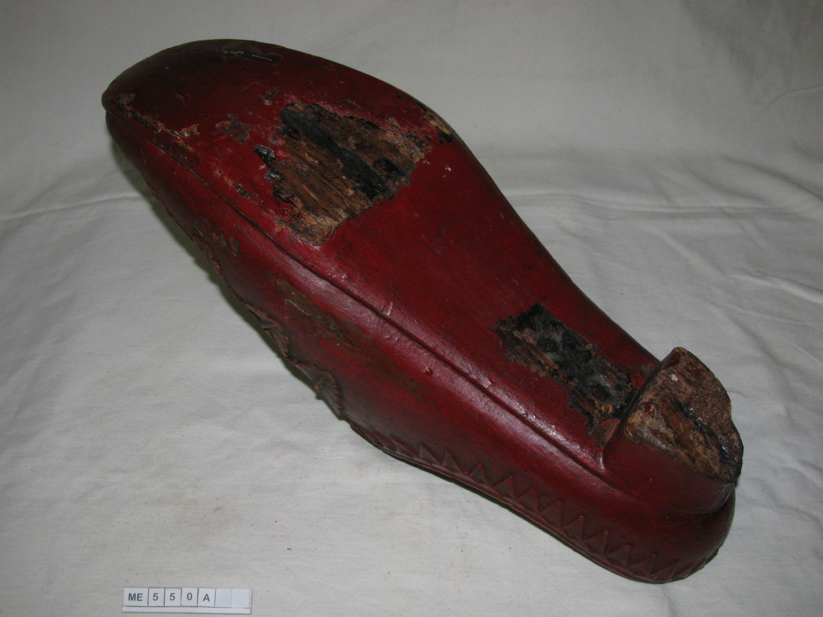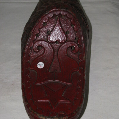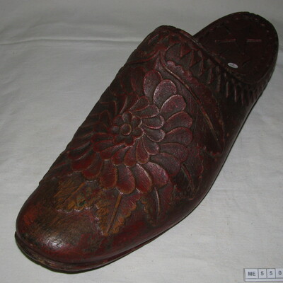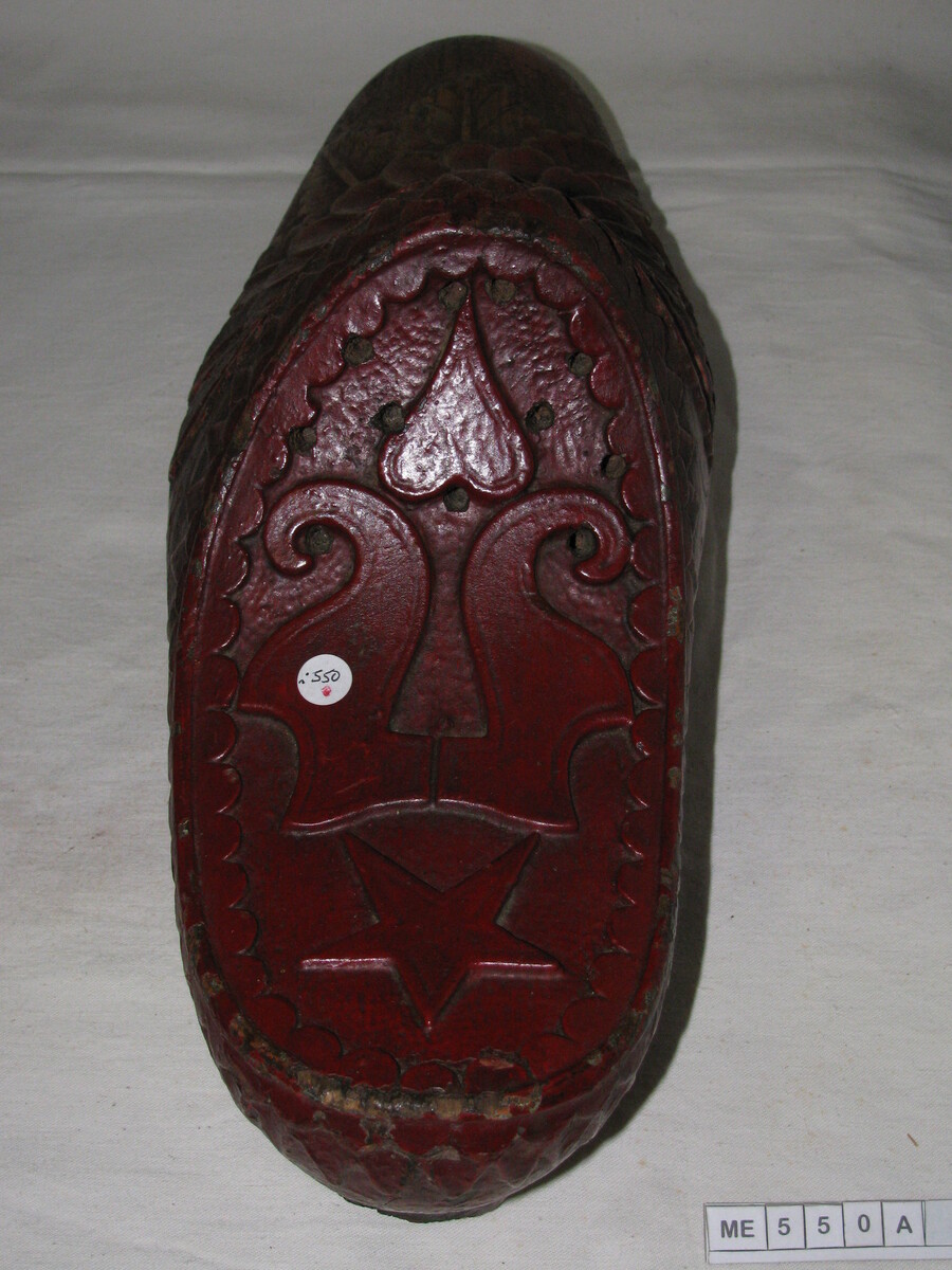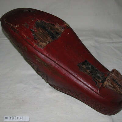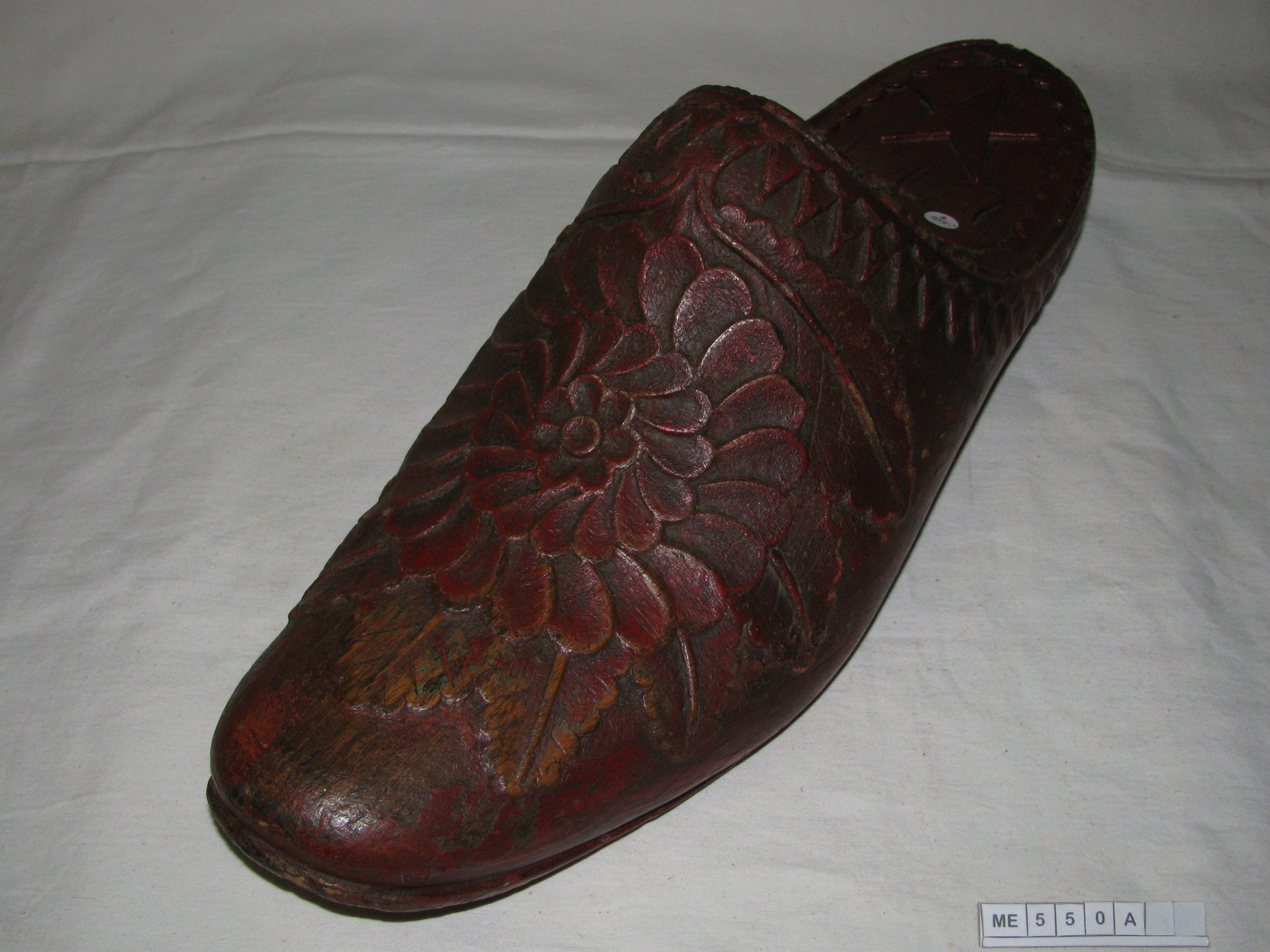 Uithangbord klomp, kapklomp, gesloten. Hoge hak en ronde iets opgaande neus. Klomp is geheel voorzien van sculpturen: bloem bladeren, ster, hart. Rood.