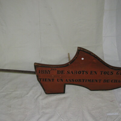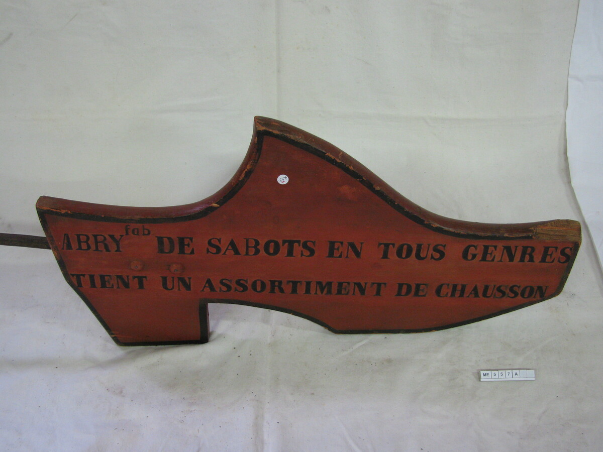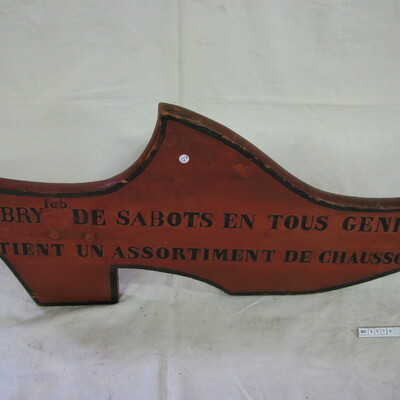 Uithangbord klomp, kapklomp, plat. Hoge hak, stompe punt. Met geschilderde tekst: Abry fab De Sabots En Tous Genres Tient Un Assortiment De Chausson. IJzeren pen. Bruin, Zwart.