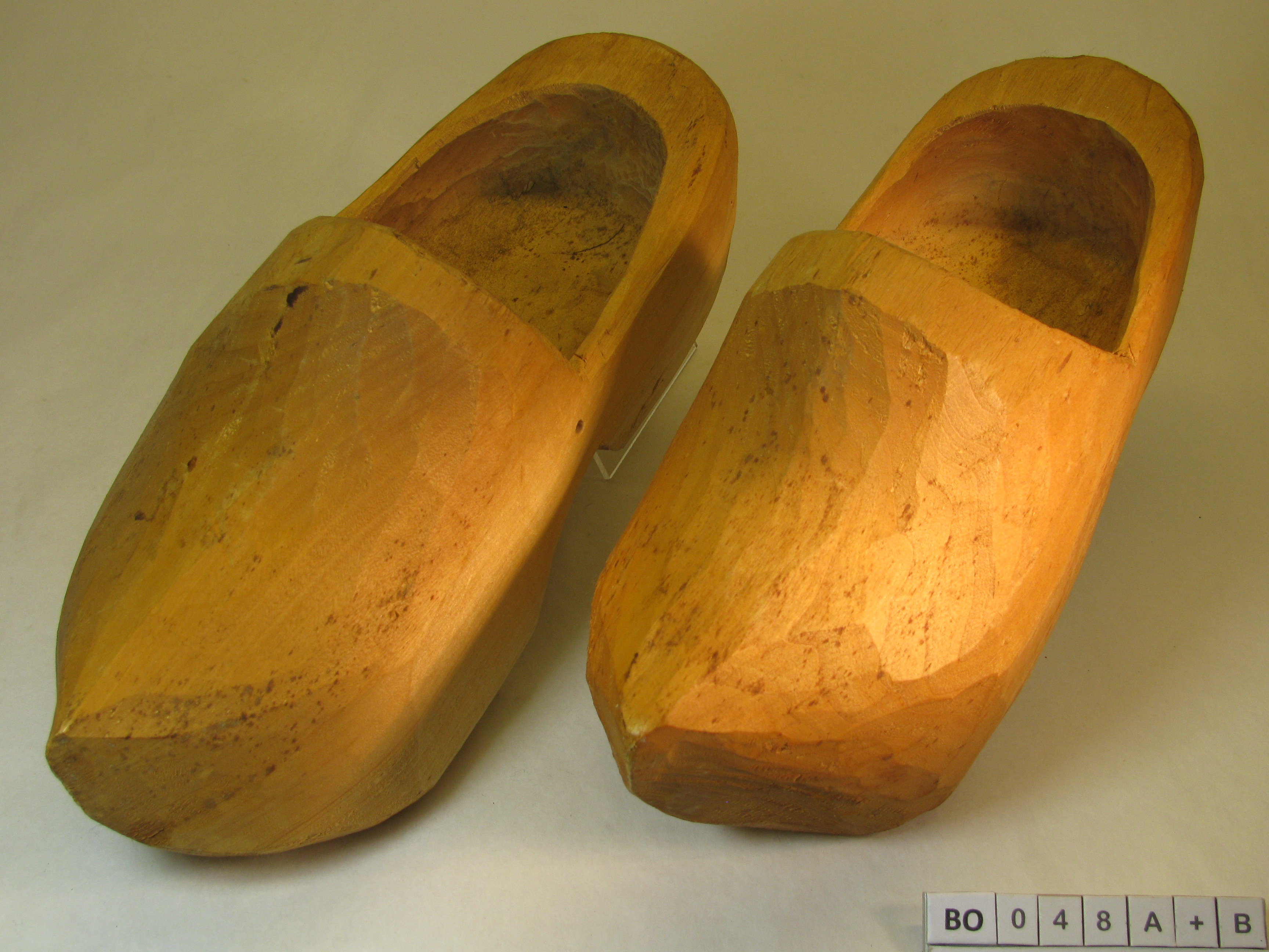 Kapklomp met mesafdrukken. Opgaande puntige neus, hoge hak. Veel hout aan de hak! , "ruw" model. Nagemaakt model. Kleur: Blank.