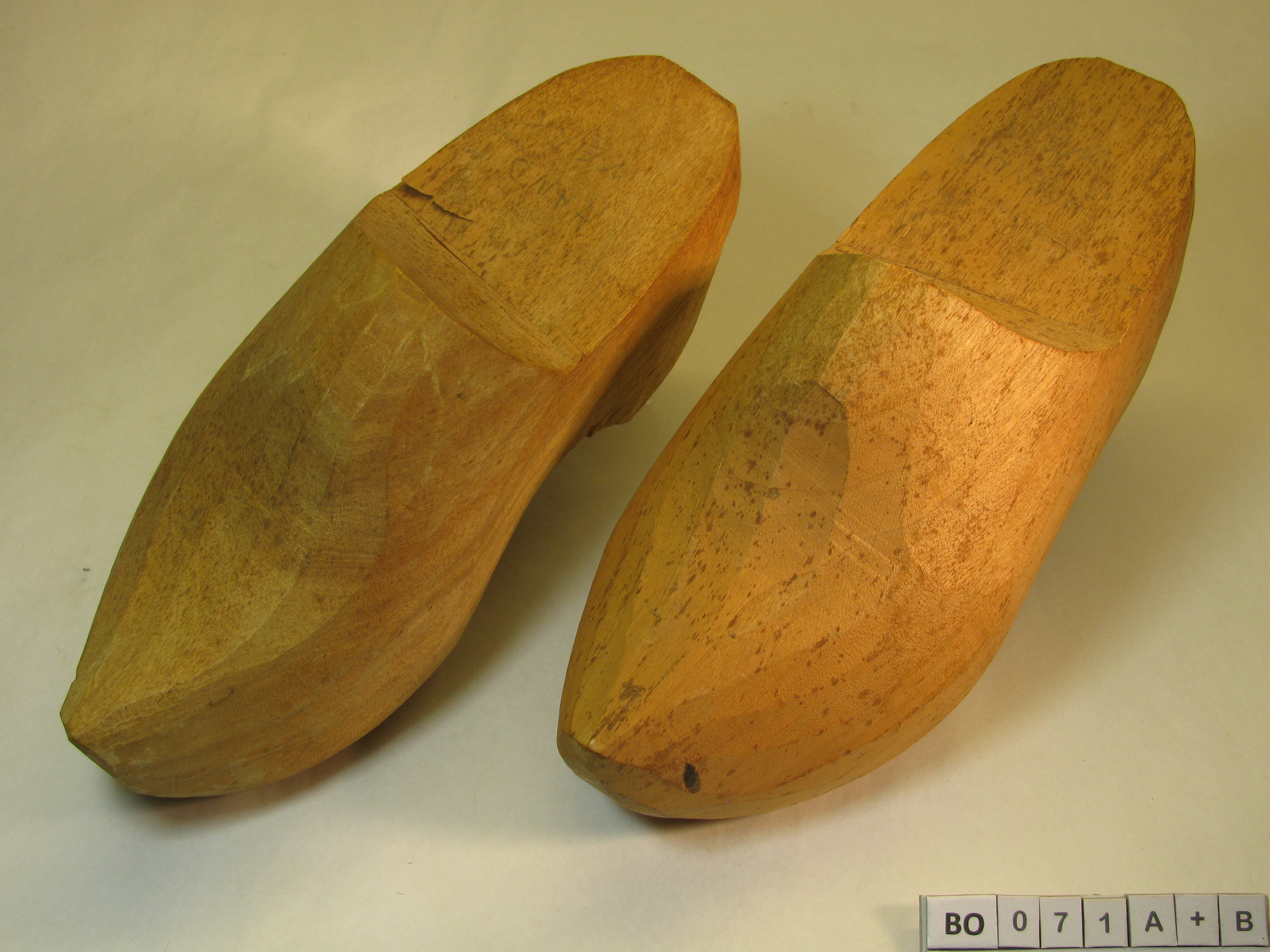 Modelklompen, kinderklompen. Iets stompe opgaande neus, hoge wreef. Niet uitgehold. Lage hak, blokmes streken zijn niet glad geschuurd. Onbewerkt. Kleur: Blank.