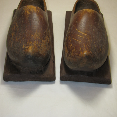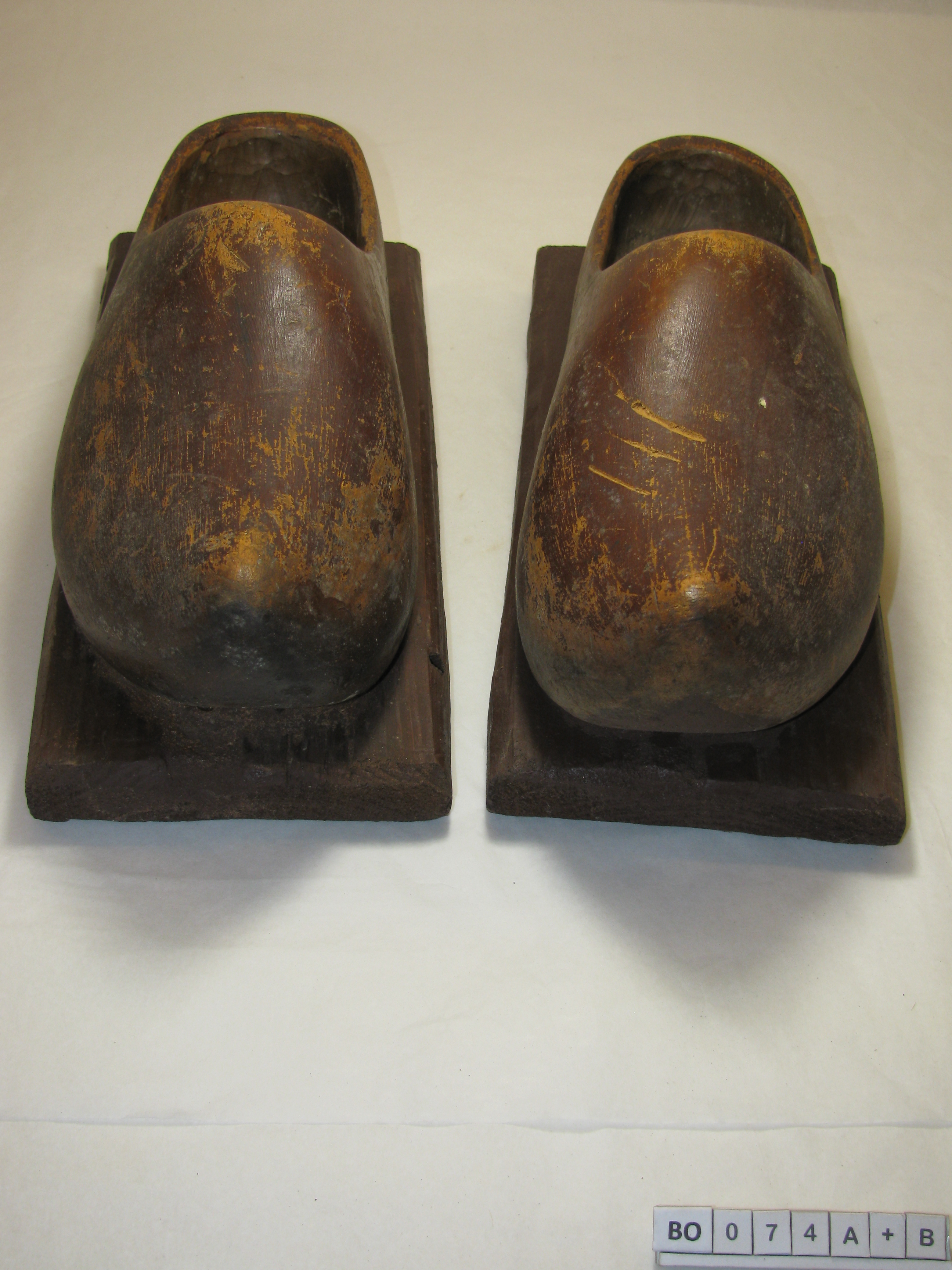 Herenklompen, kapmodel. Opgaande neus met vlakje vooraan en iets stompe neus, iets hoger dan de kap. Hoge bolle wreef, lage hak. Vastgezet op plankje. Verf van de klompen met draagslijtage. Plankjes opnieuw geverfd, opgevuld met houtvulling en extra vastgeschroefd. Rood, bruin.