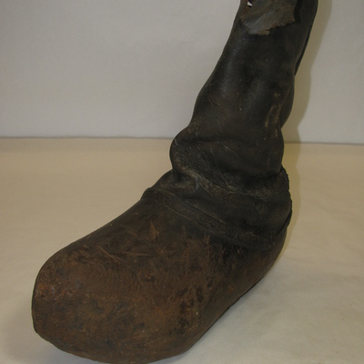 Klomplaars, houten klomp, geheel bedekt. Opgaande neus, spits toelopend. Een hoge klomp, geen verhoging op de wreef. Uitholling tussen hak en voorvoet erg lang, zodat een kleine hak over blijft. Gebruiksslijtage van kerven op de neus. Kuit hoge schacht, enkel leer met hiel stuk (met de hand gemaakt) en reep aan achterzijde vastgezet met extra leerbandje en spijkers. Bruin.