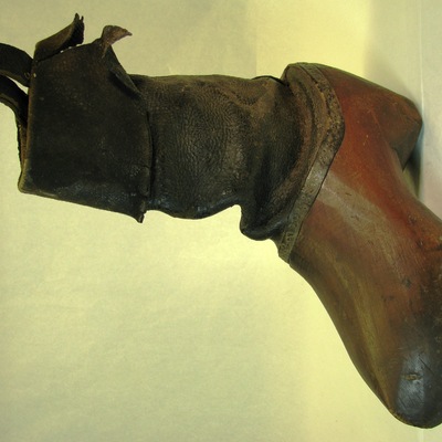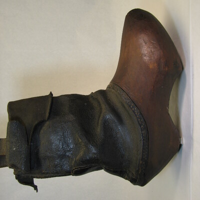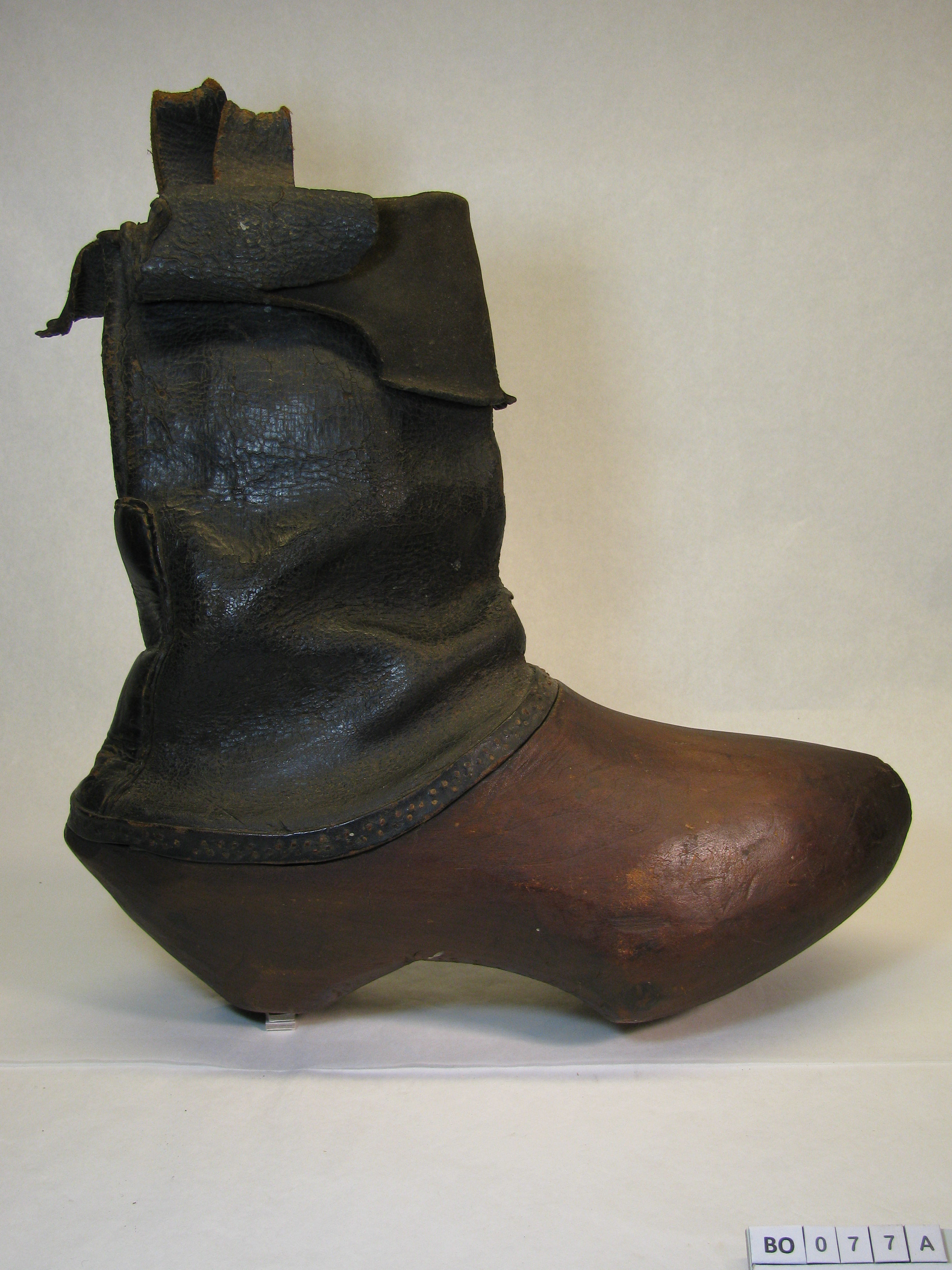 Herenklomp, laarsmodel, houten voet, bedekt. Iets stompe opgaande neus. Stelt onder bal van voet, hiel schuin aflopend naar de hak. lage hak. Kuit hoge schacht met terug slag bovenaan en 2 lipjes. Versterking aan achterzijde. Vastgezet met extra leren band. Hout volledig bruin gelakt. Kleur: Bruin.