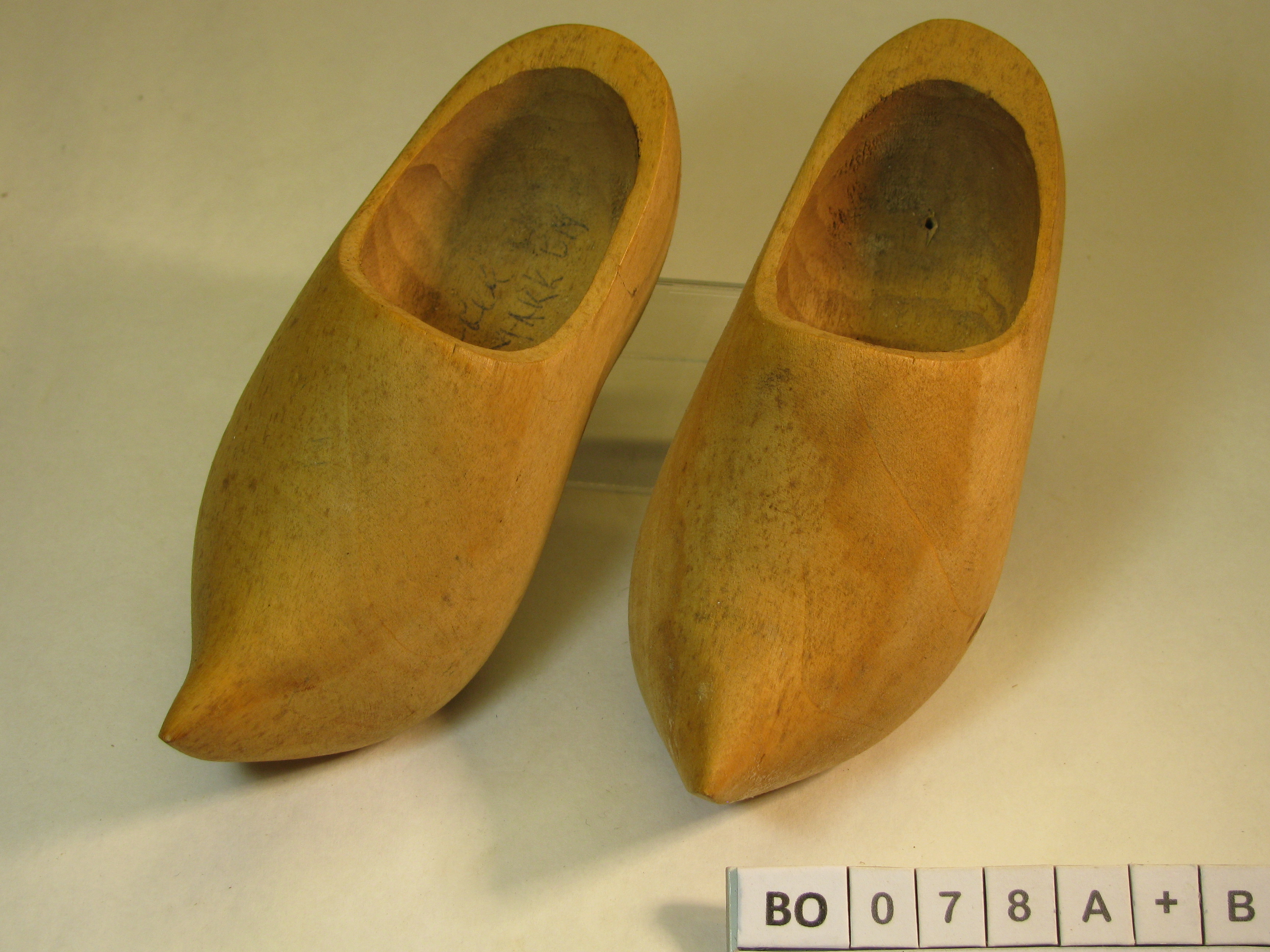 Souvenirklompje Alkmaars model. Kapklompje met schuine hiel, lage hak, sterke opgaande puntige neus. Kleur: Blank.