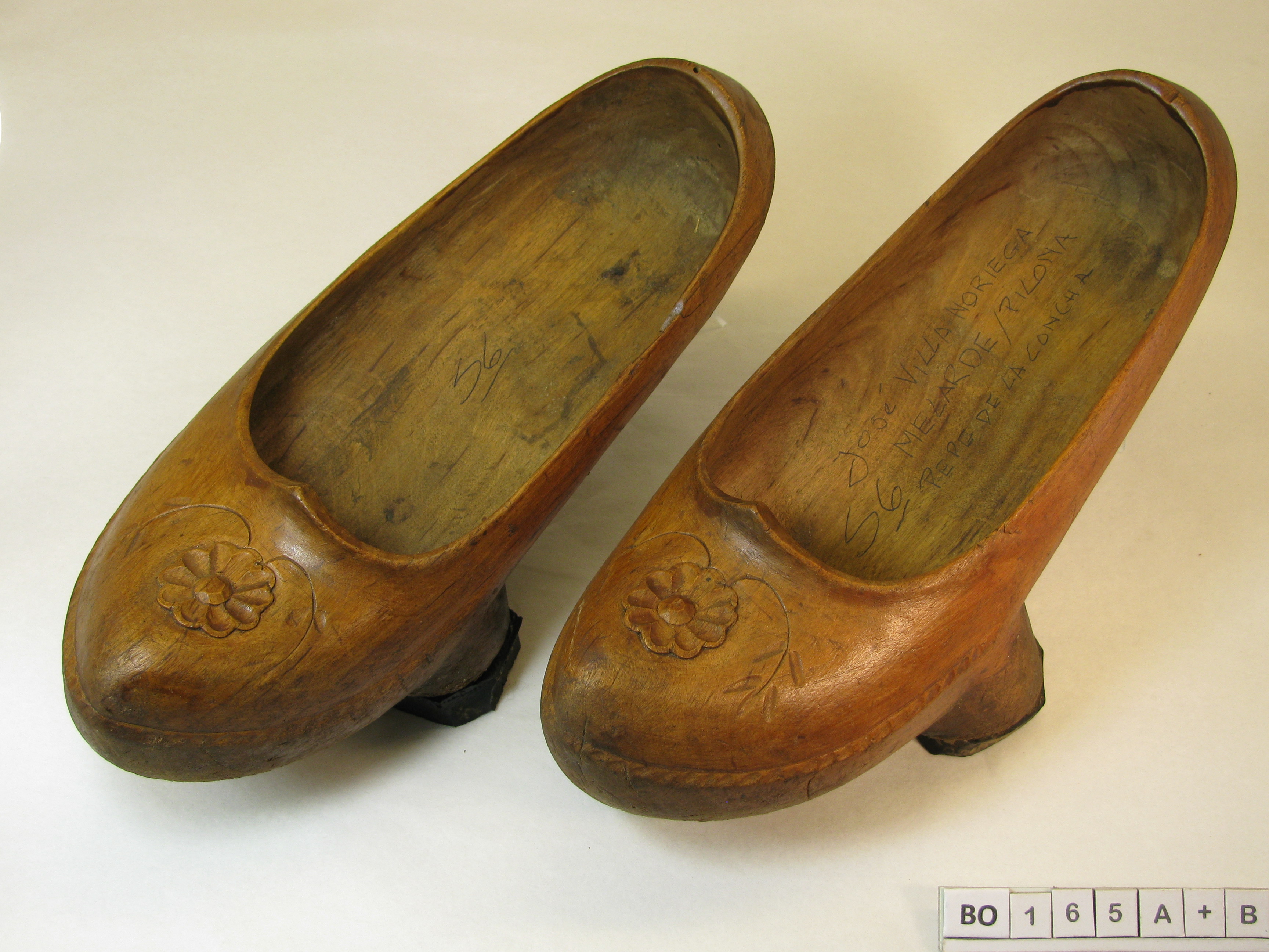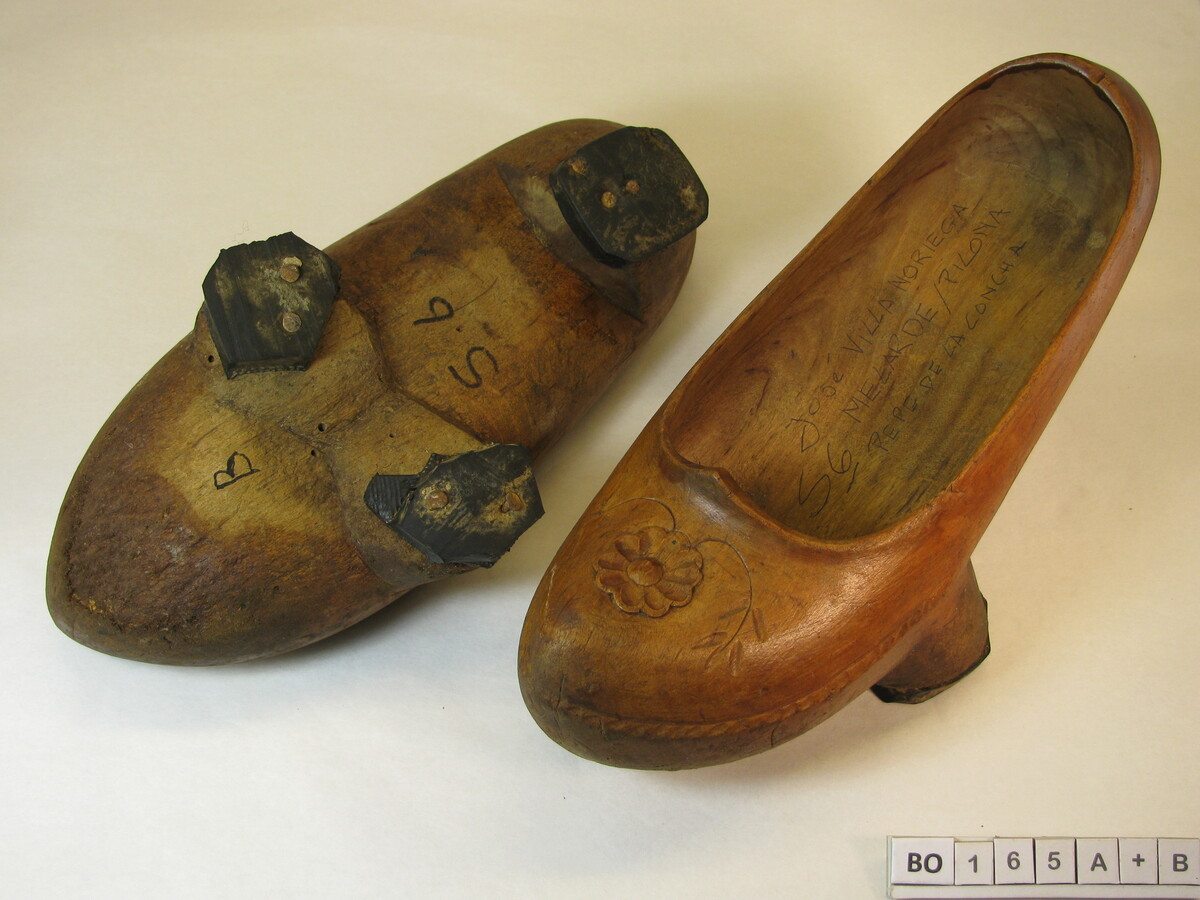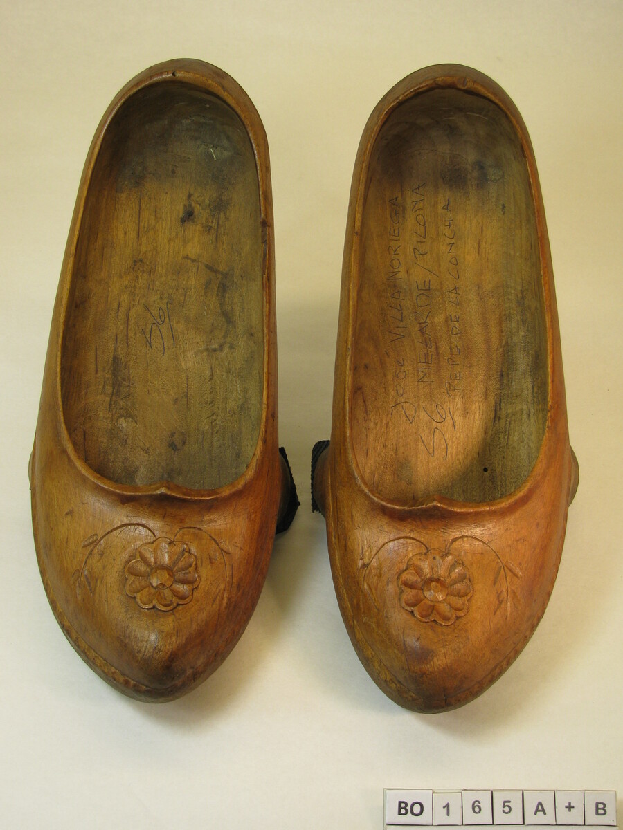 Kapklomp, half bedekt. Steltklomp met 3 steltjes, 2 onder de voorvoet, 1 onder de hak, voorzien van stukjes rubber. Ronde hiel, stompe opgaande neus. Wreef heeft iets opstaande punt. Ritswerk op de kap, bloemetje met 2 takjes. Bruin