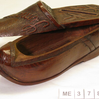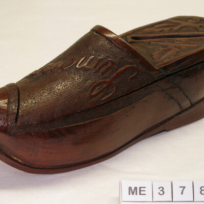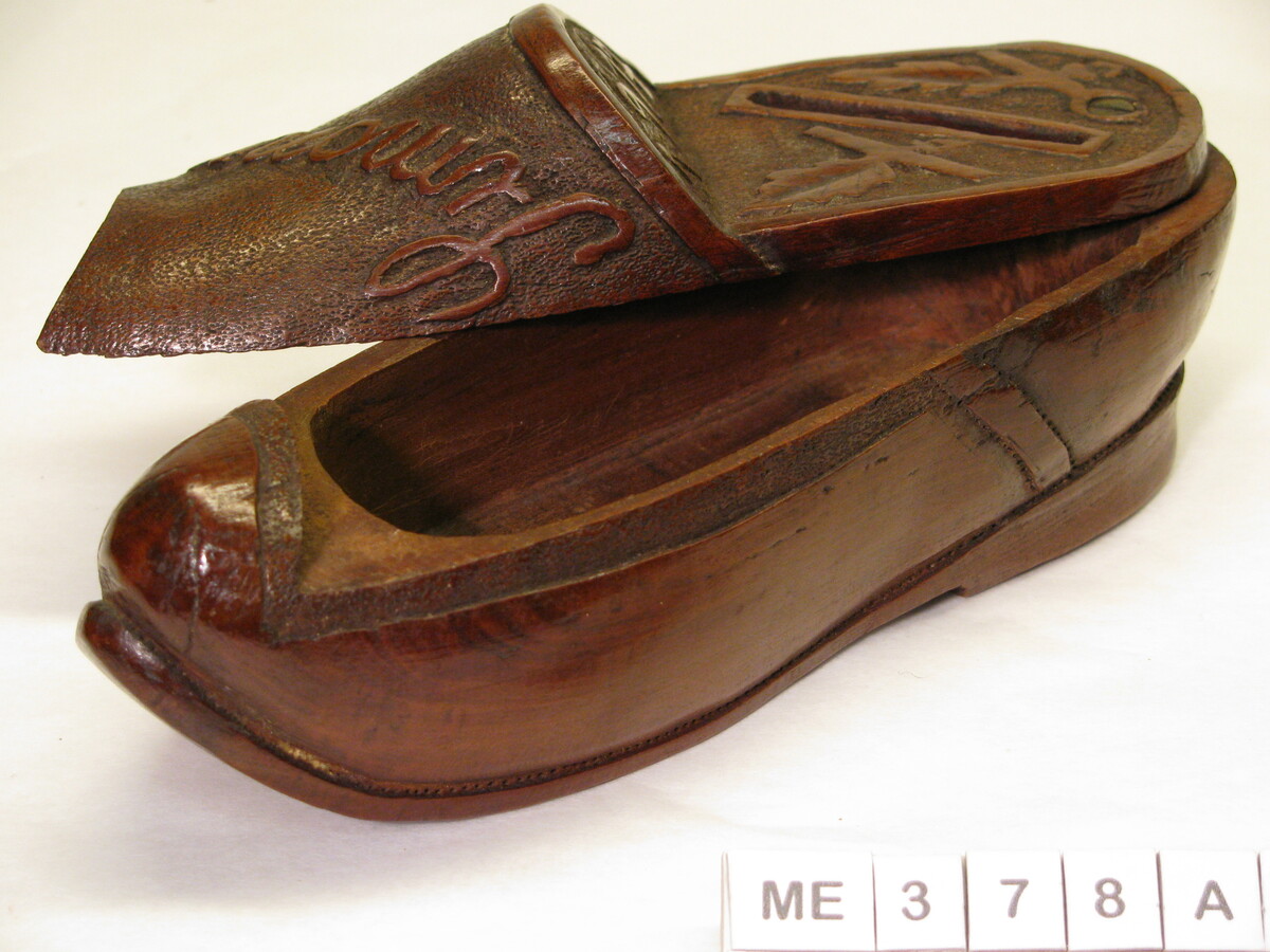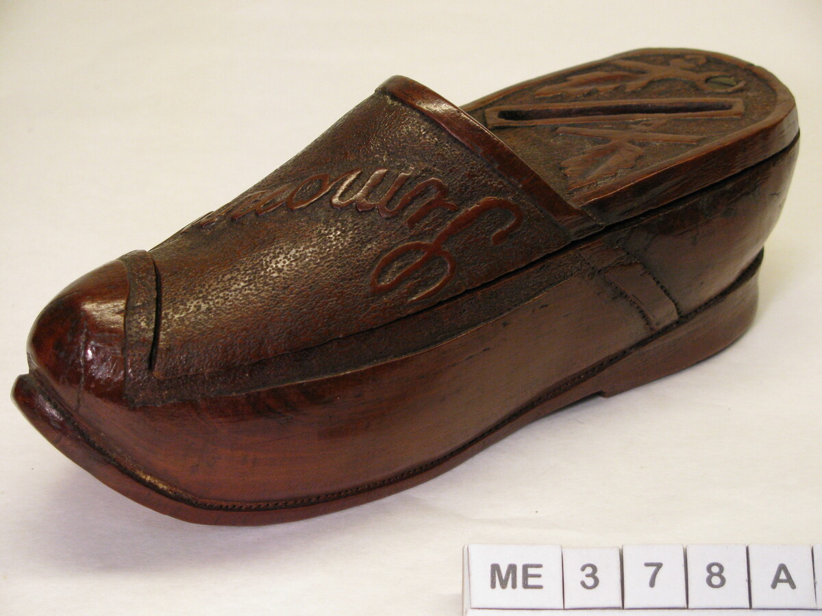 Klomp met dichte bovenzijde, draaibare deksel met gleuf: spaarpotje. Op kap de naam Simonne, 1917, blaadjes: sculpturen. Kleur: Bruin.