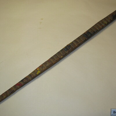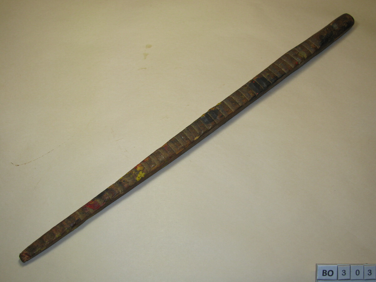Houten maatlatje, iets taps toelopend met gaatje voor ophanging. Inkepingen over de gehele lengte. Gebruikt, met enige verfresten. Bruin.