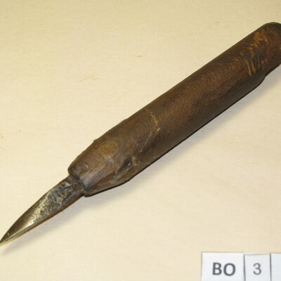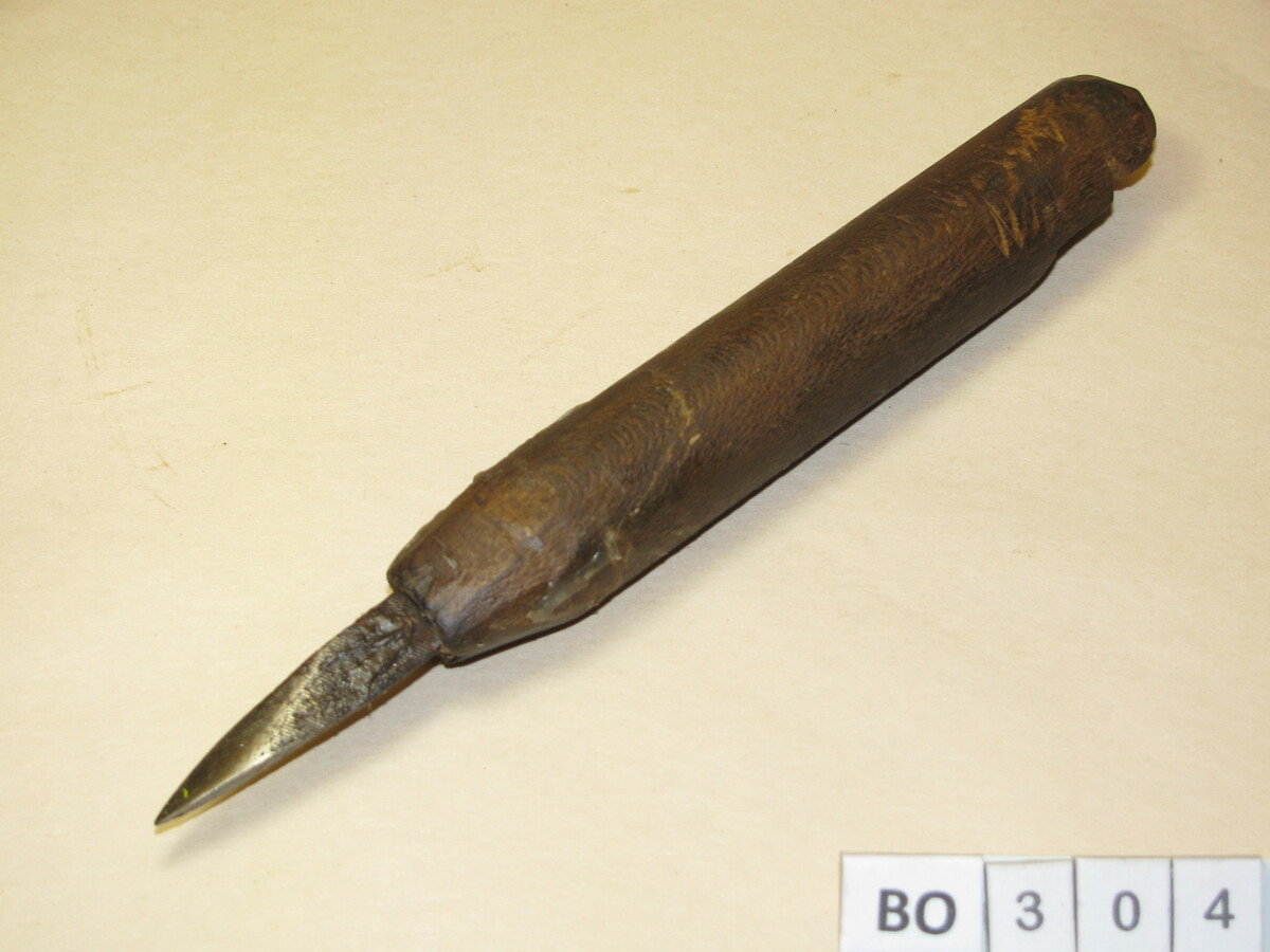 Slijpstaal met houten handvat en driehoekig puntig stuk staal. Bruin.