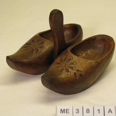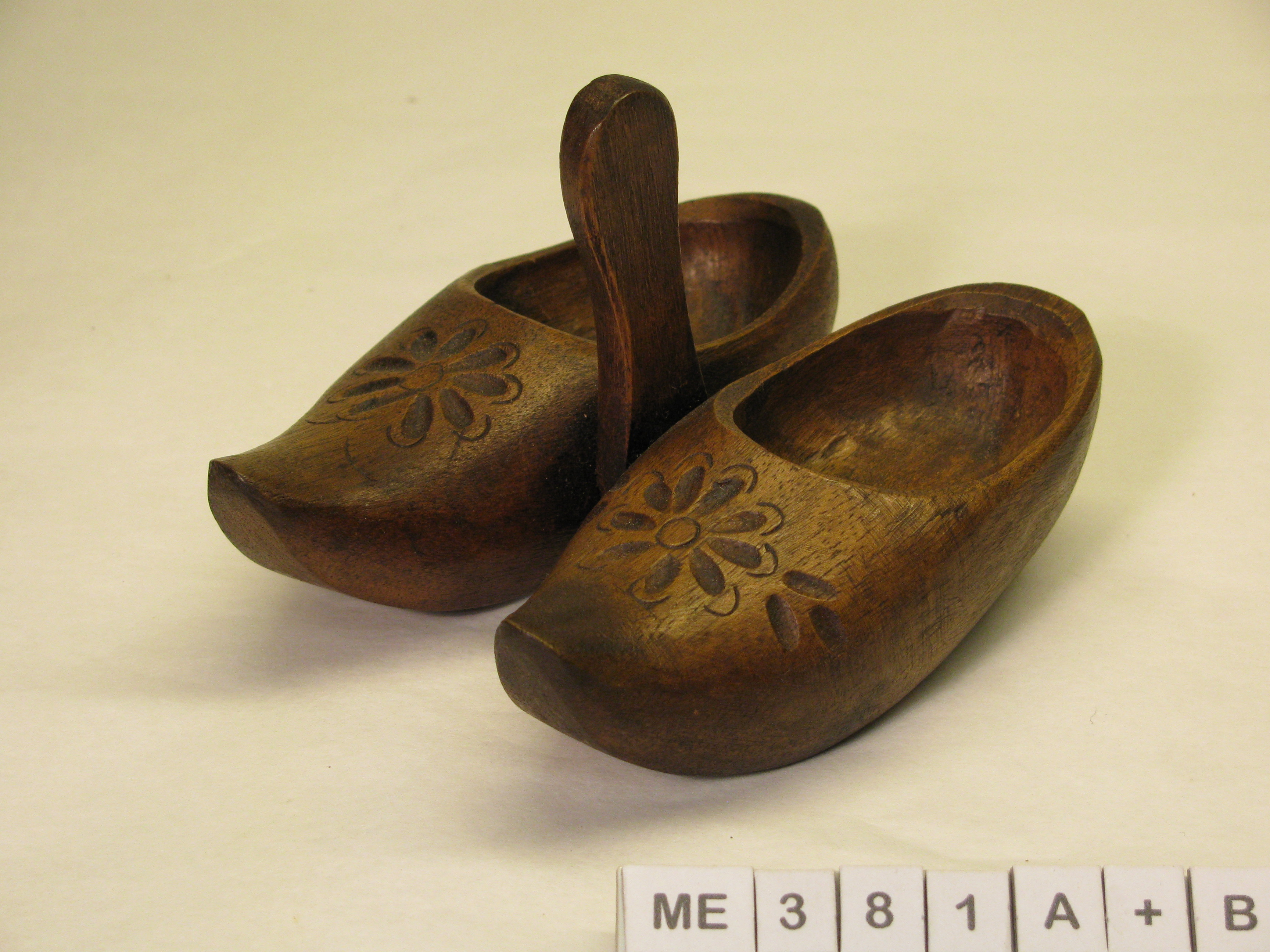 Twee klompjes aan elkaar met handvaatje. Het is een peper en zoutstelletje. Ritswerk op de kap: bloem. Kleur: bruin.