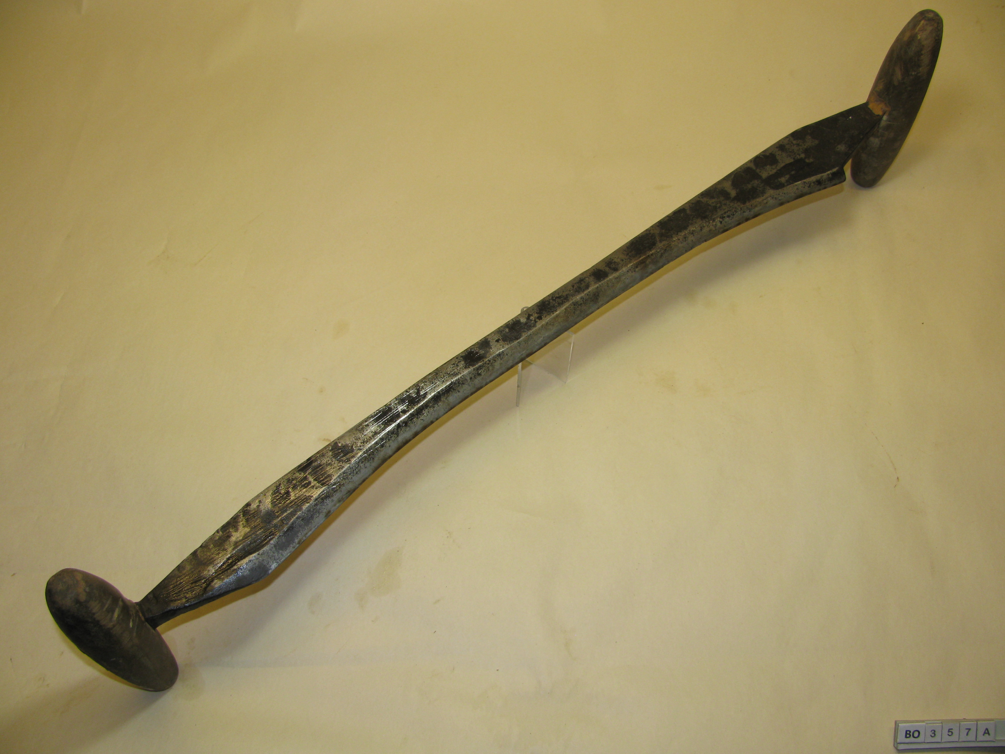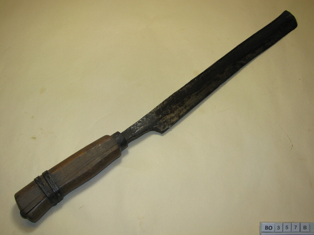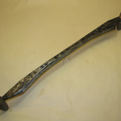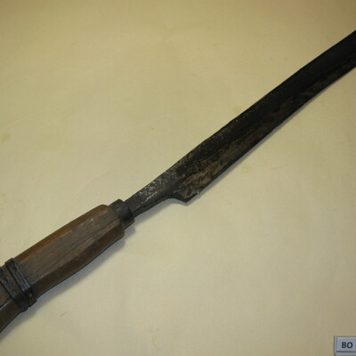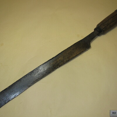 A: Groot ijzeren gebogen mes met twee houten handvaten.