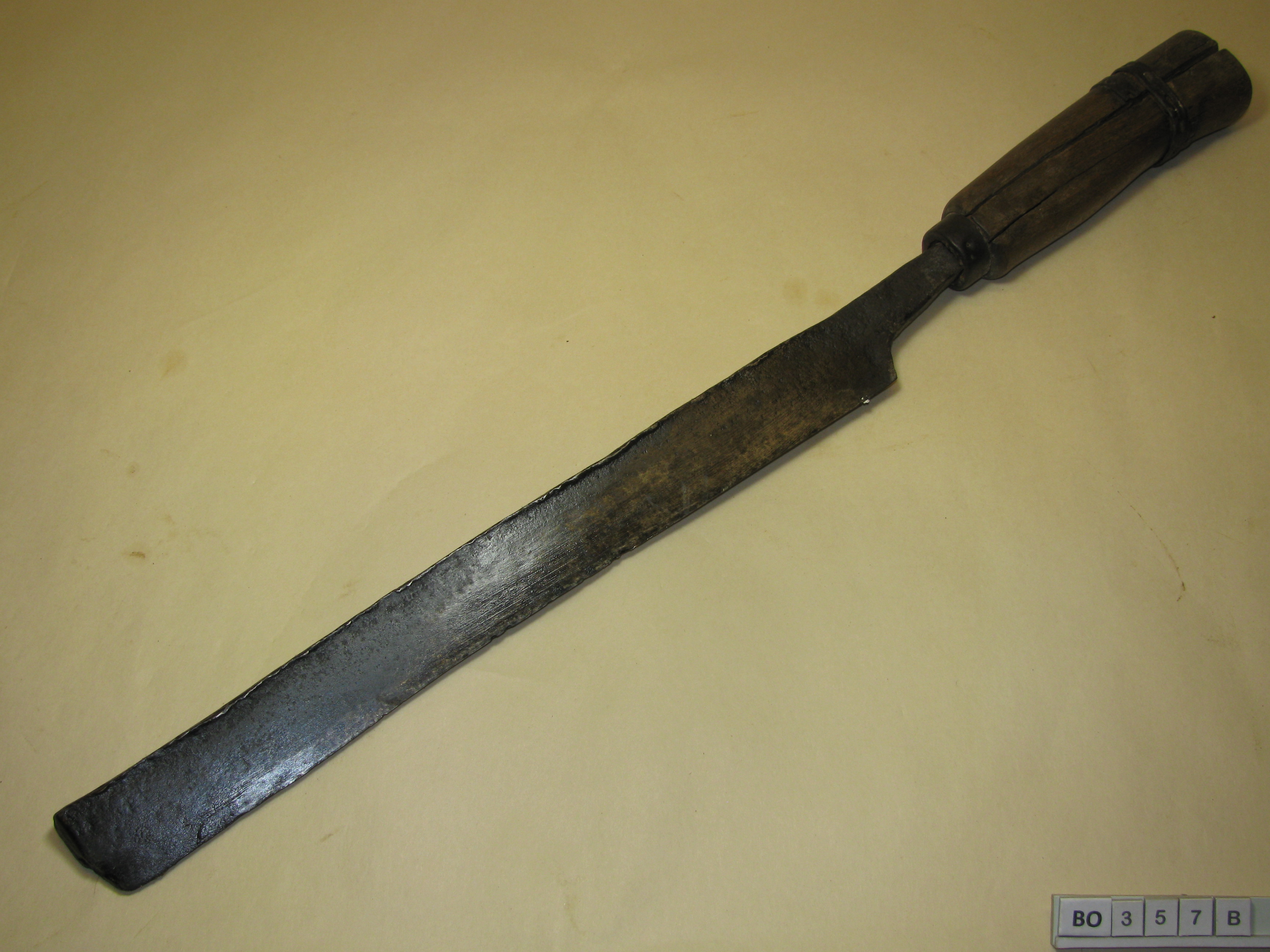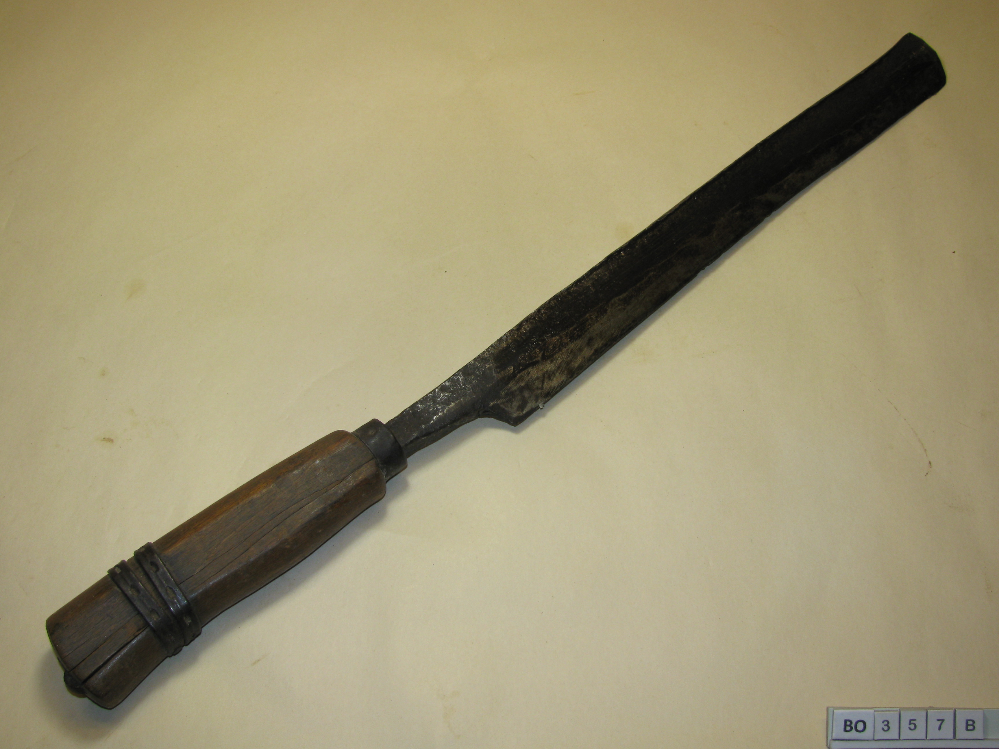 B: IJzeren mes (oud blokmes?) met houten handvat met ring. Handvat gescheurd en gerepareerd met kramband. Zwart, bruin.
