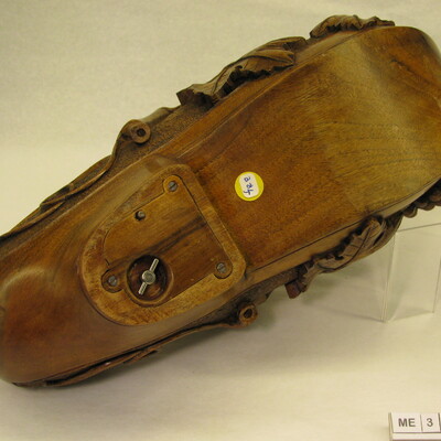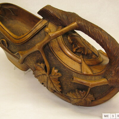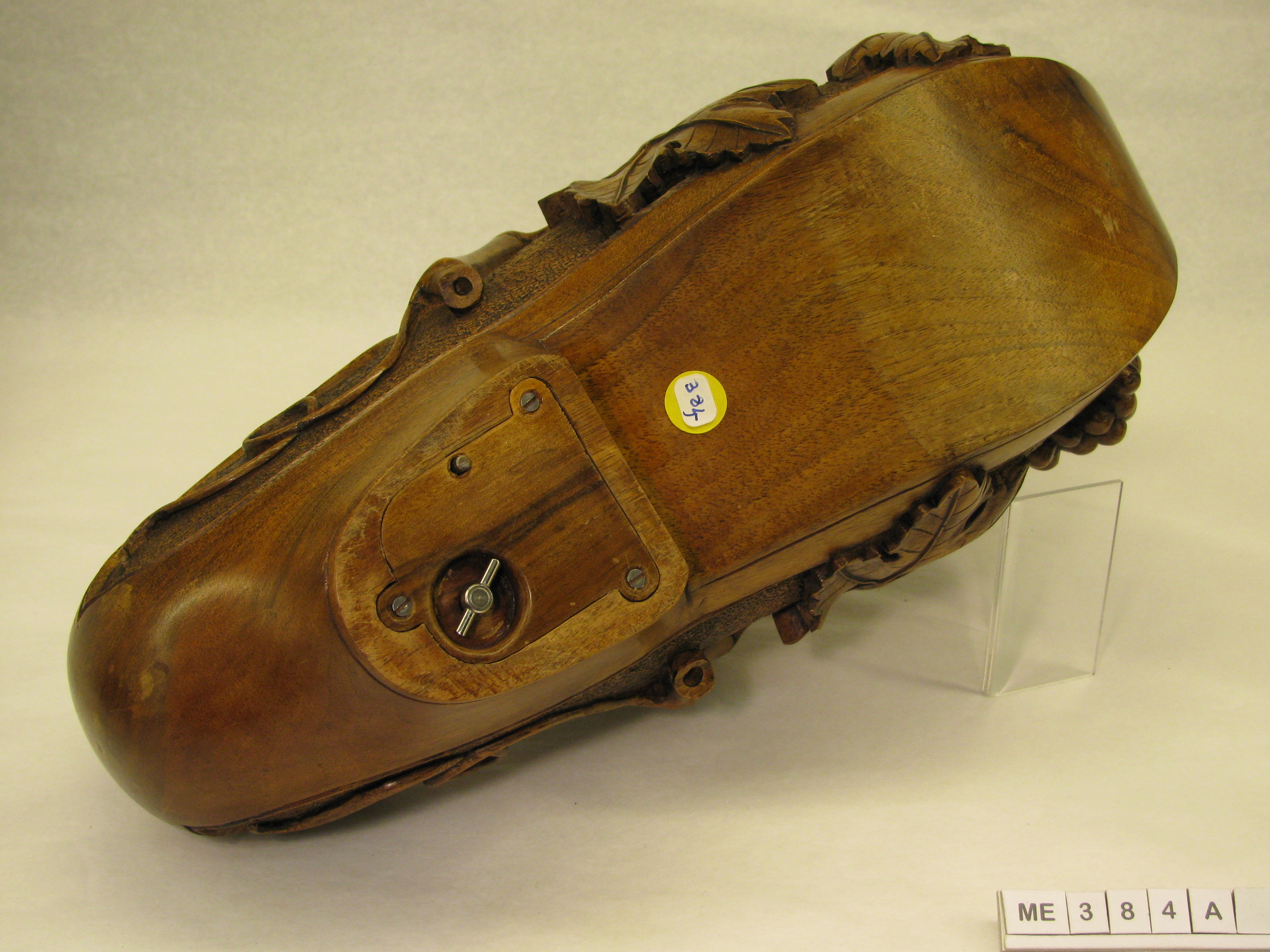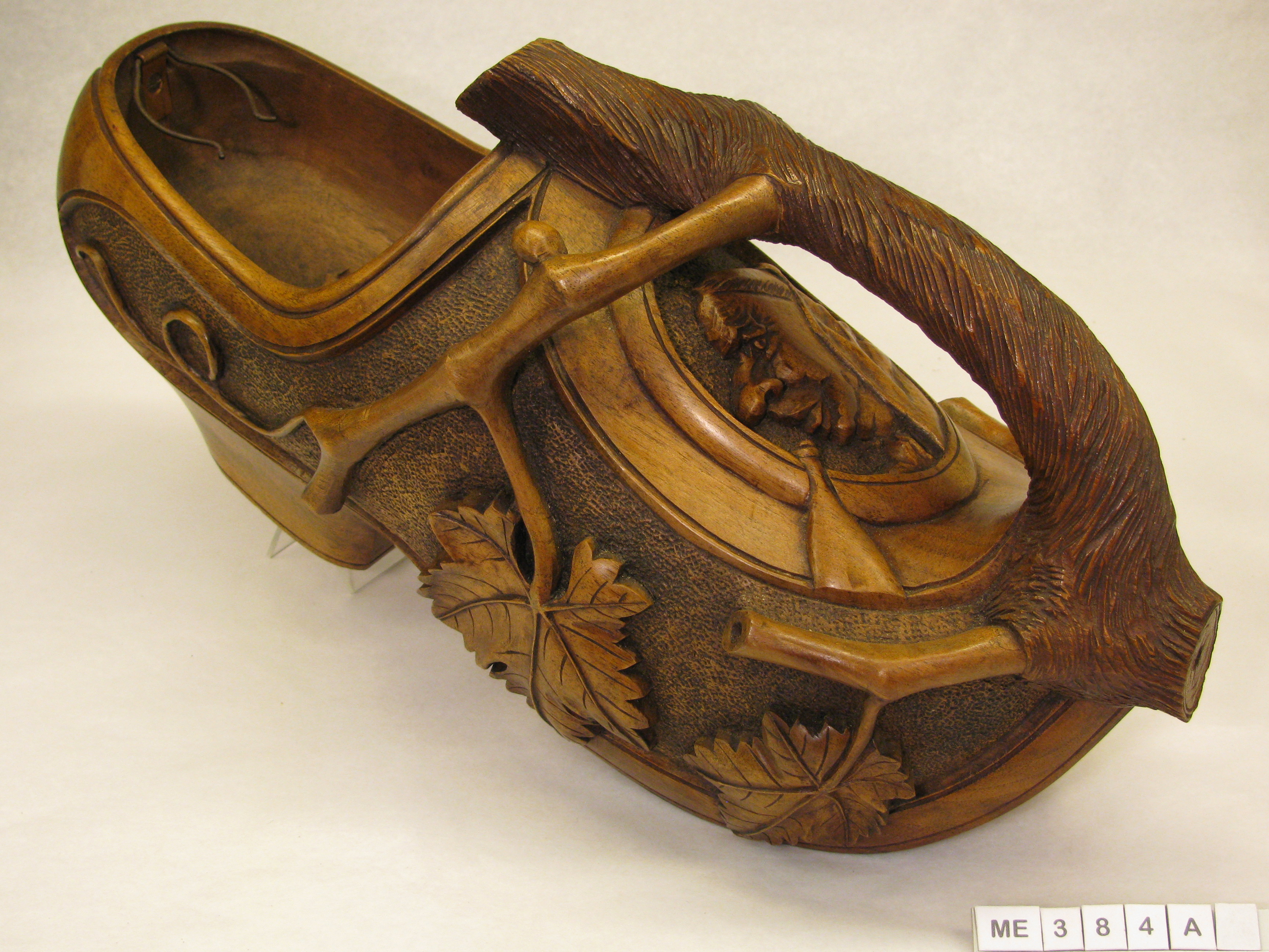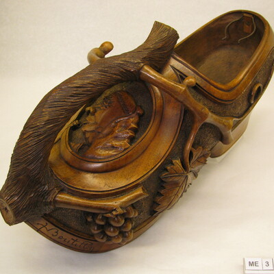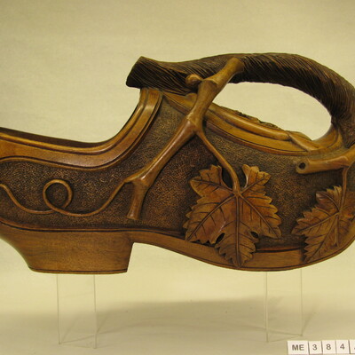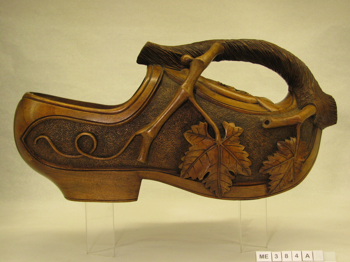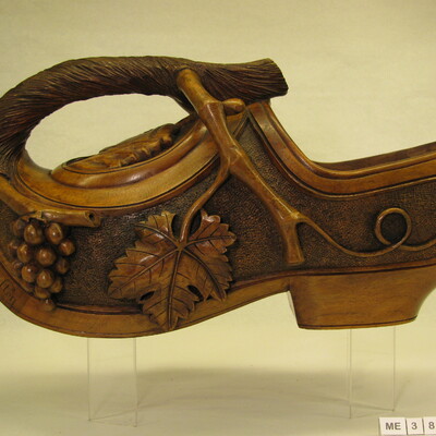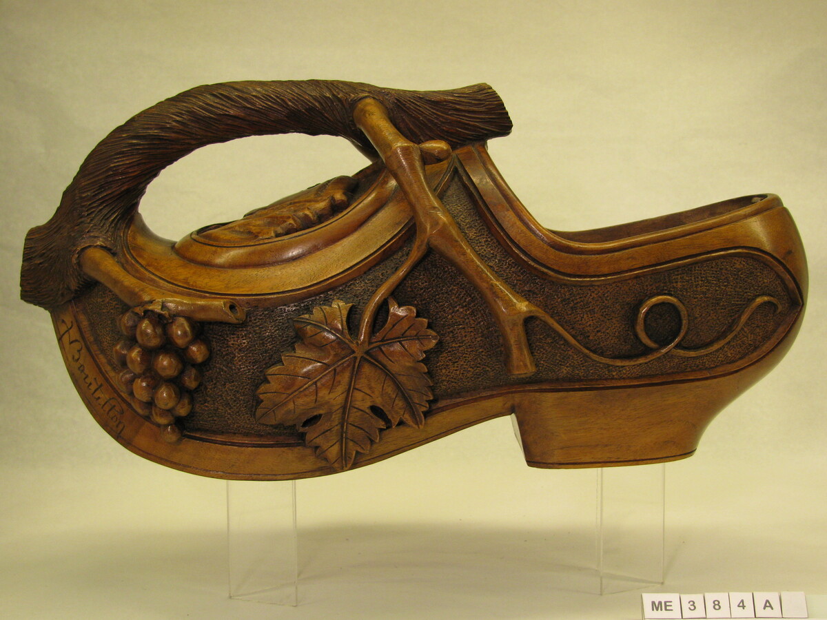Kapklomp, hoge hak, opgaande punt, op de kap een druiventak als handvat met zijtakken met bladeren en druiventrossen: sculpturen ook midden op de kap: mannenkop met fles. Tekst: Boutillion. Bijz. : in de hak zit een speeldoosje ! Kleur: Bruin.