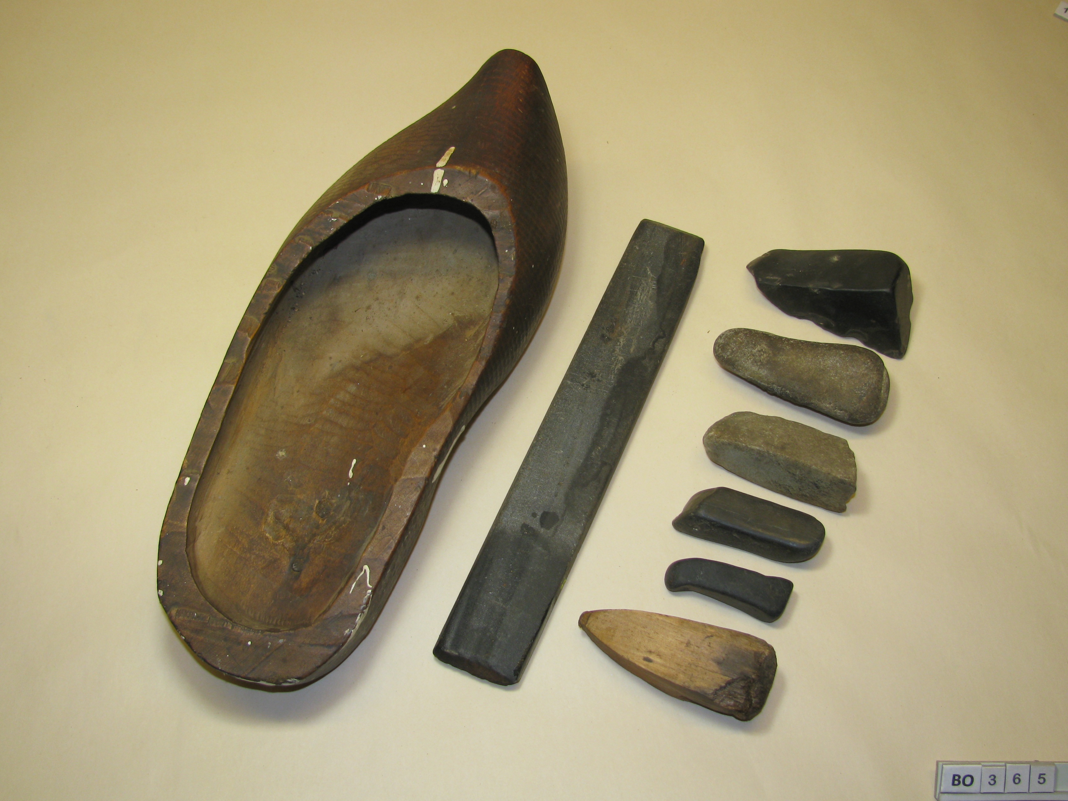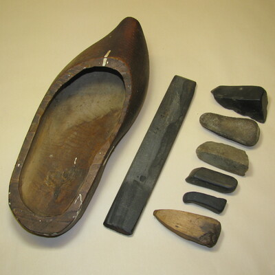 Klomp zonder hak als houder aan de wand om in de kap wet- en slijpsteentjes te bewaren (verschillende vormen), en 1 houten exemplaar. Bruin, grijs.