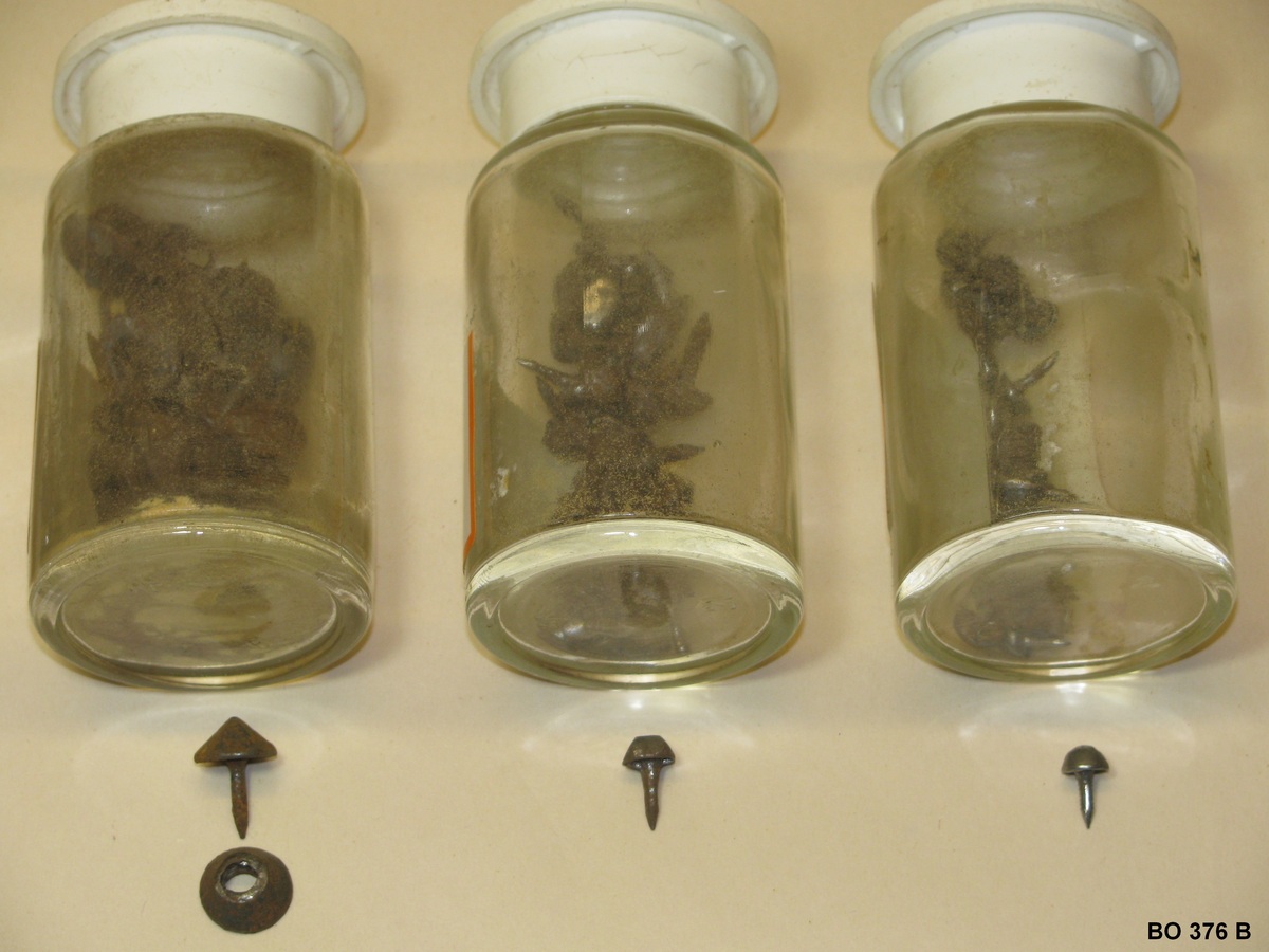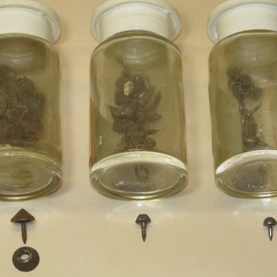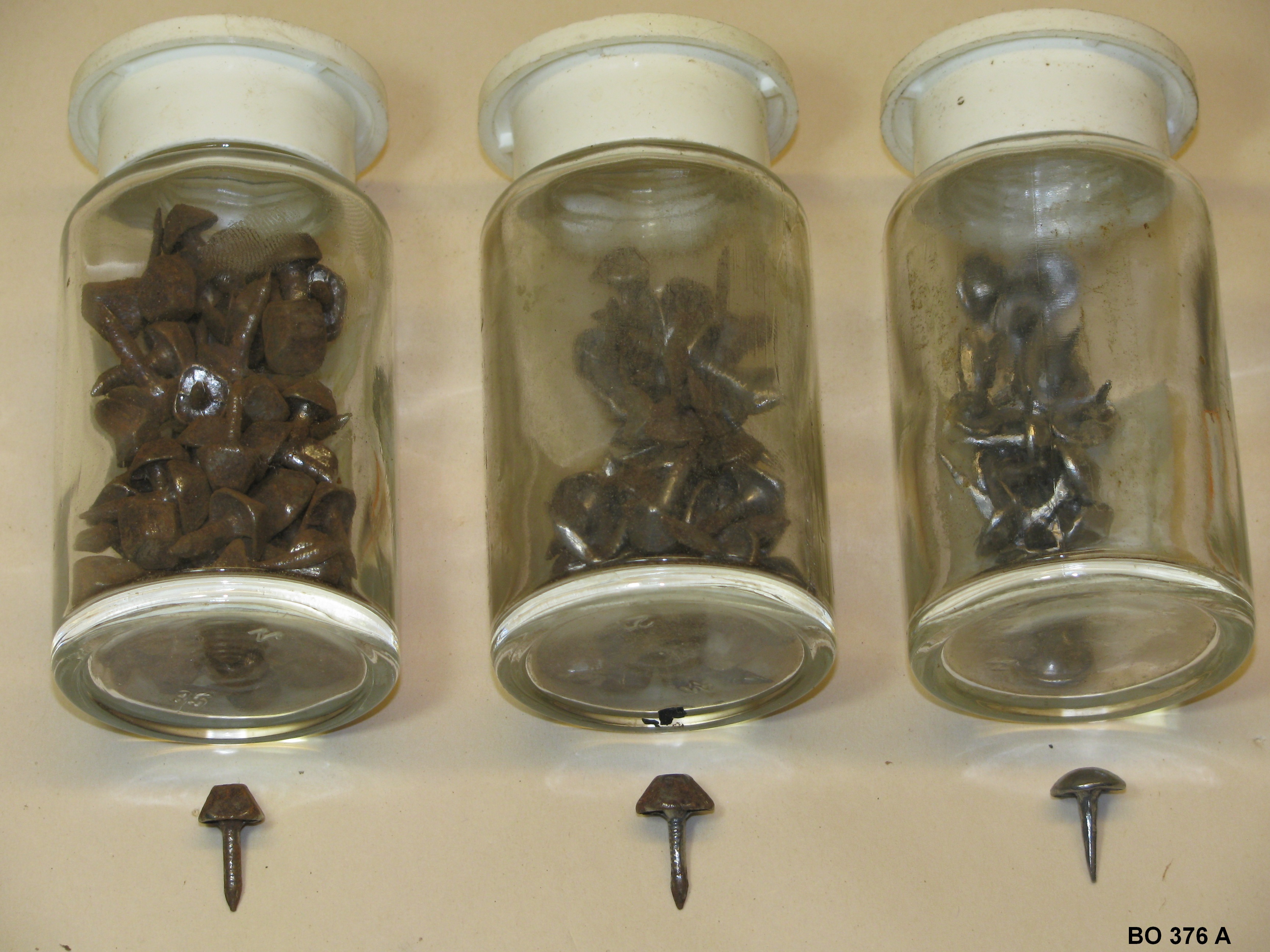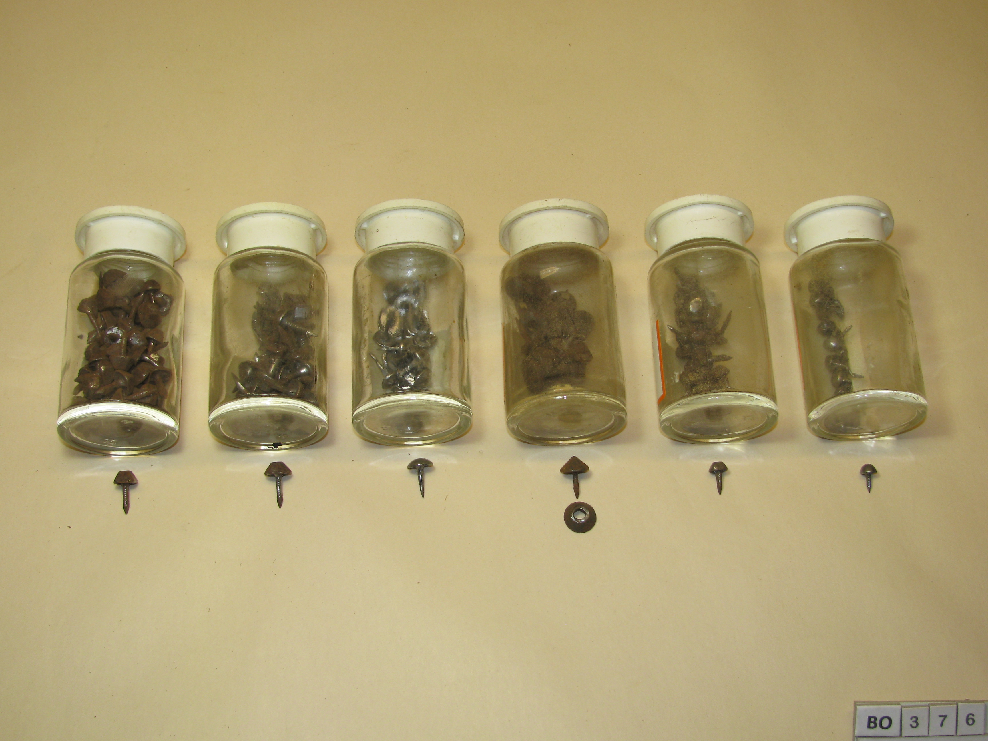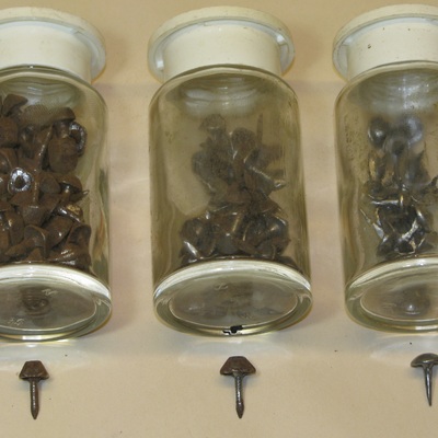 6 indentieke potjes met witte deksel, met verschillende soorten beslag/nagels. Blank.