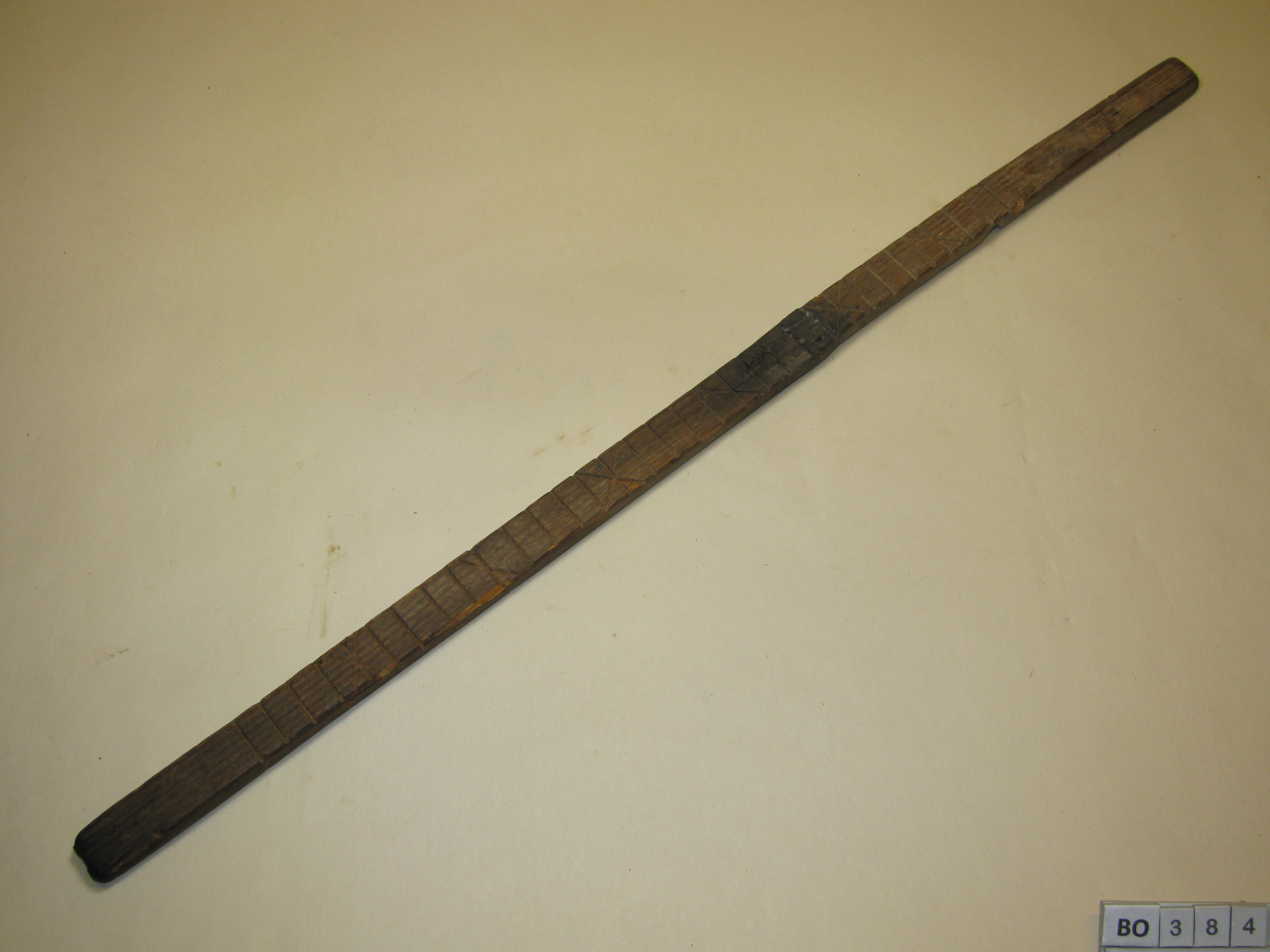 Breed houten stokje met verdeling in centimeters. Bruin.