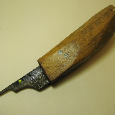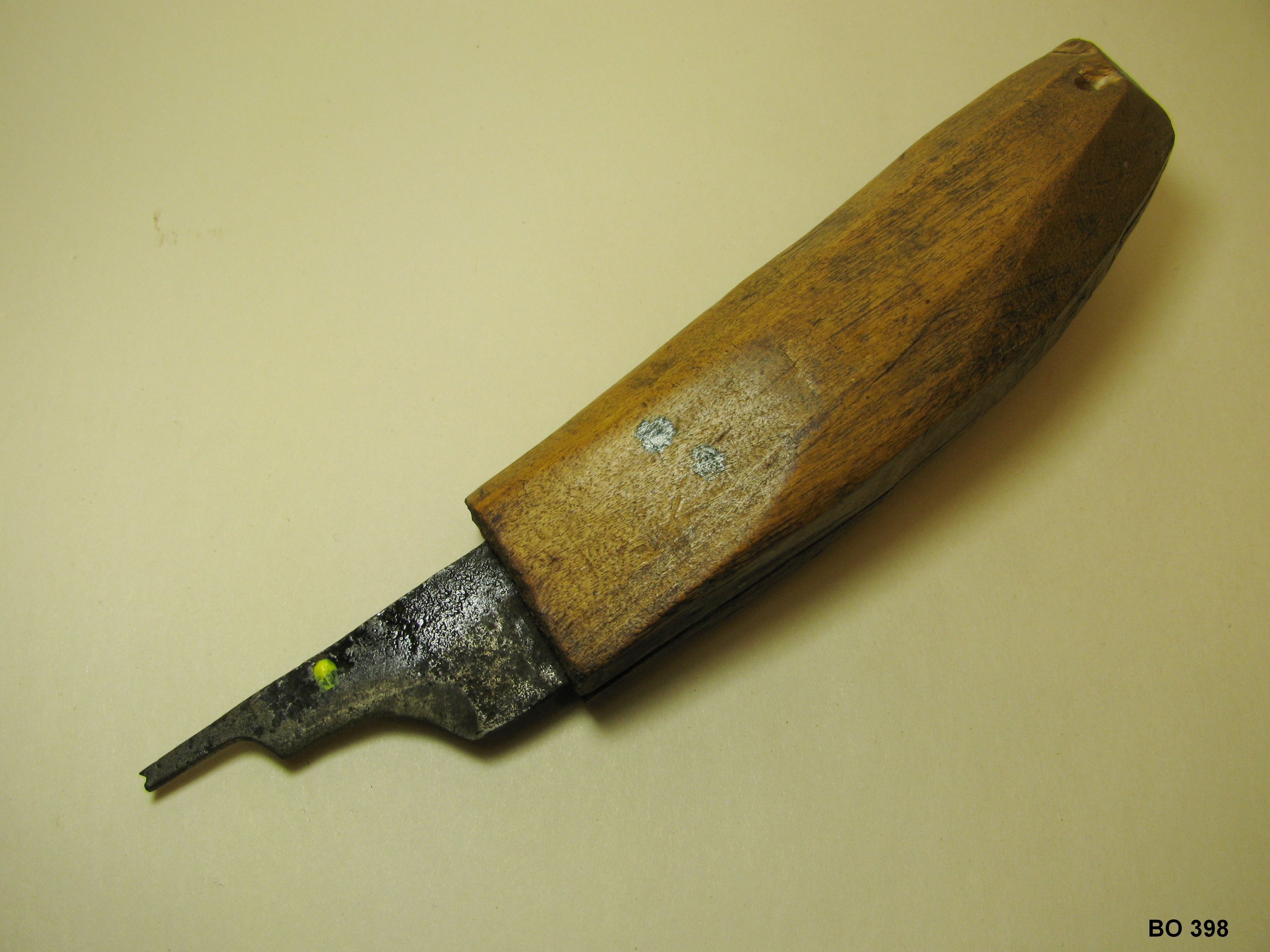 Mesje eindigend in puntje met v-vorm. Gebogen houten handvat met gat. Zwart, bruin.