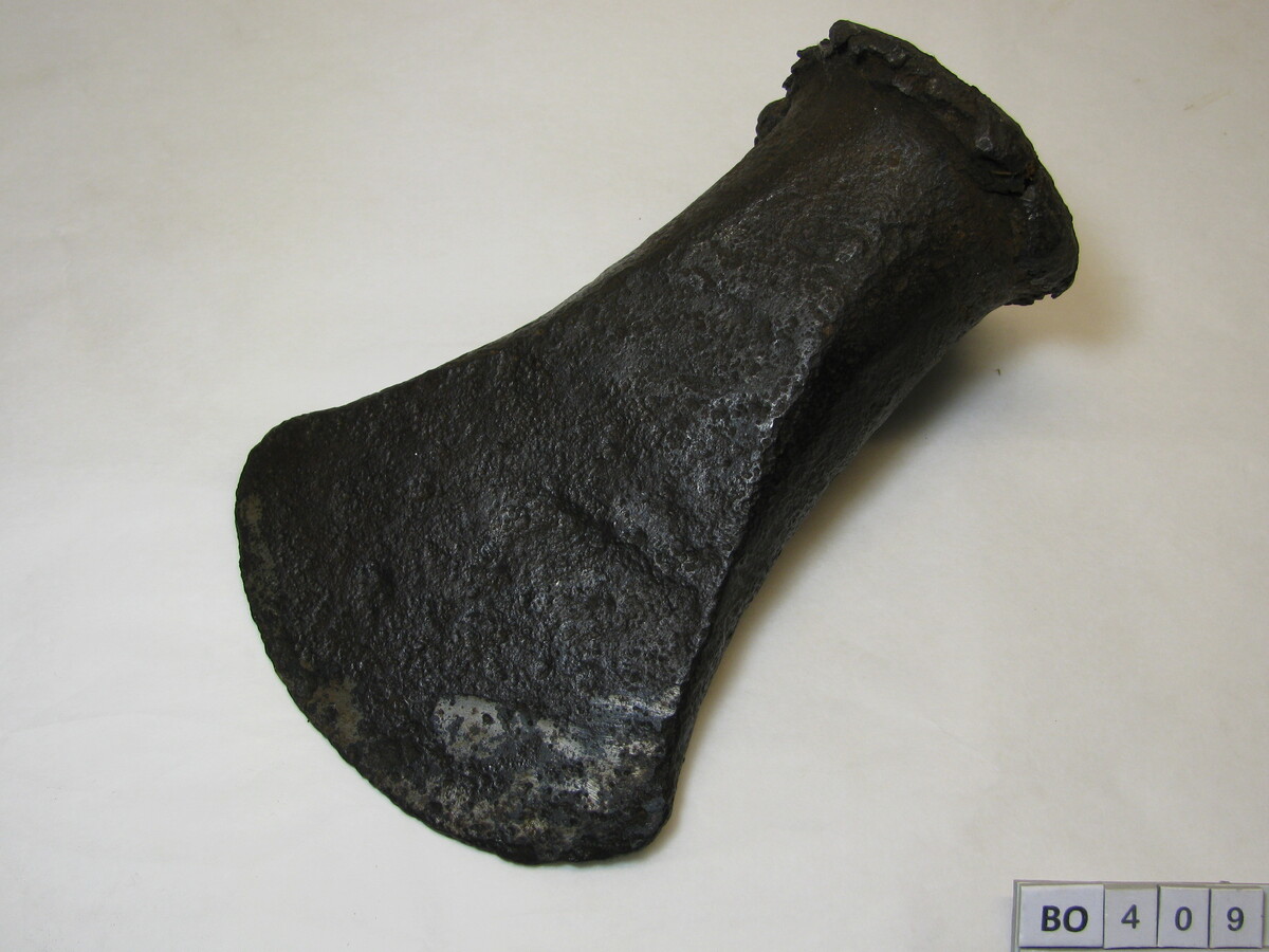 Bijlvormig stuk ijzer met dikke ronde voet met omgekruld ijzer. Zwart.