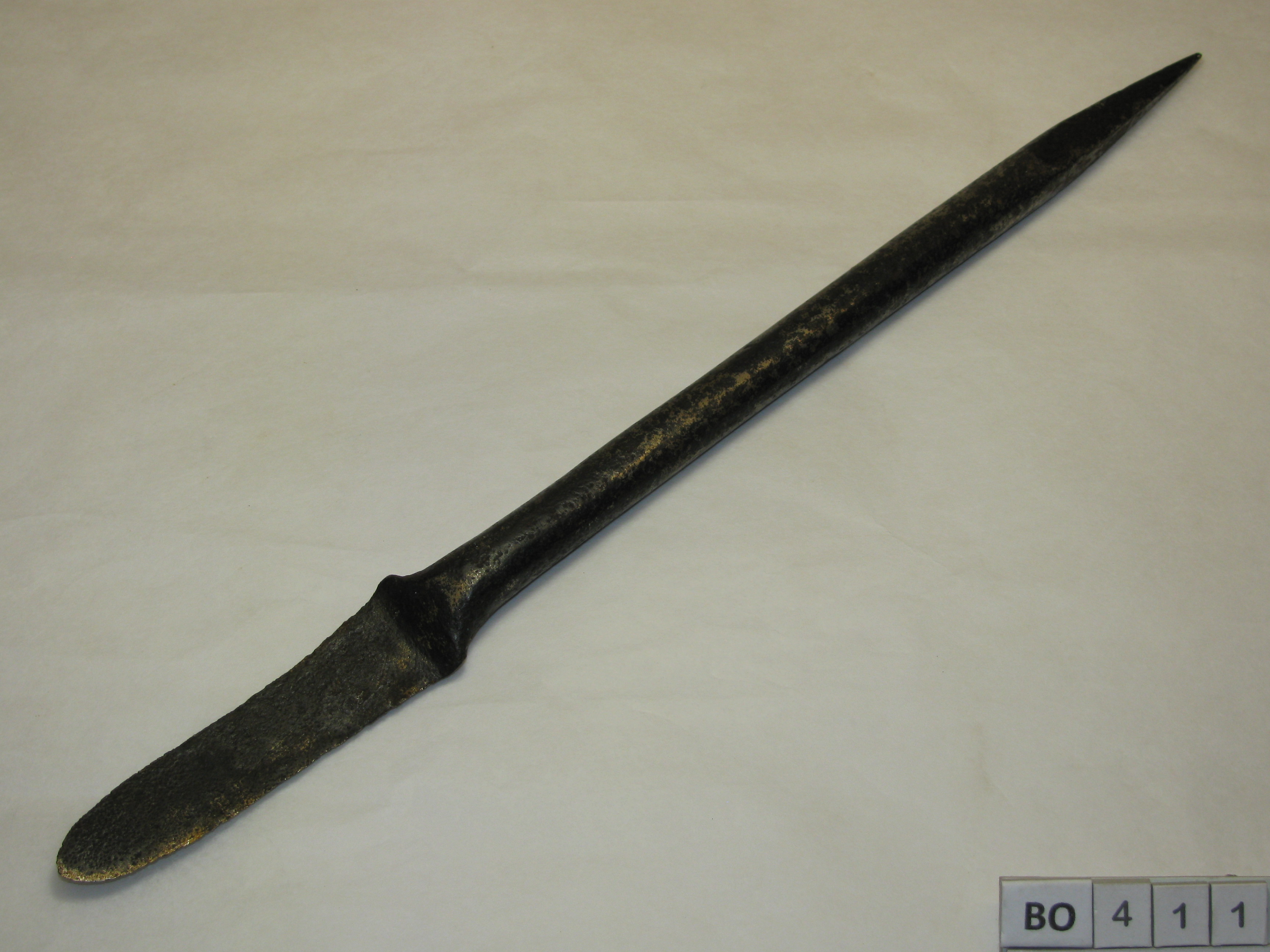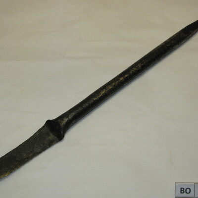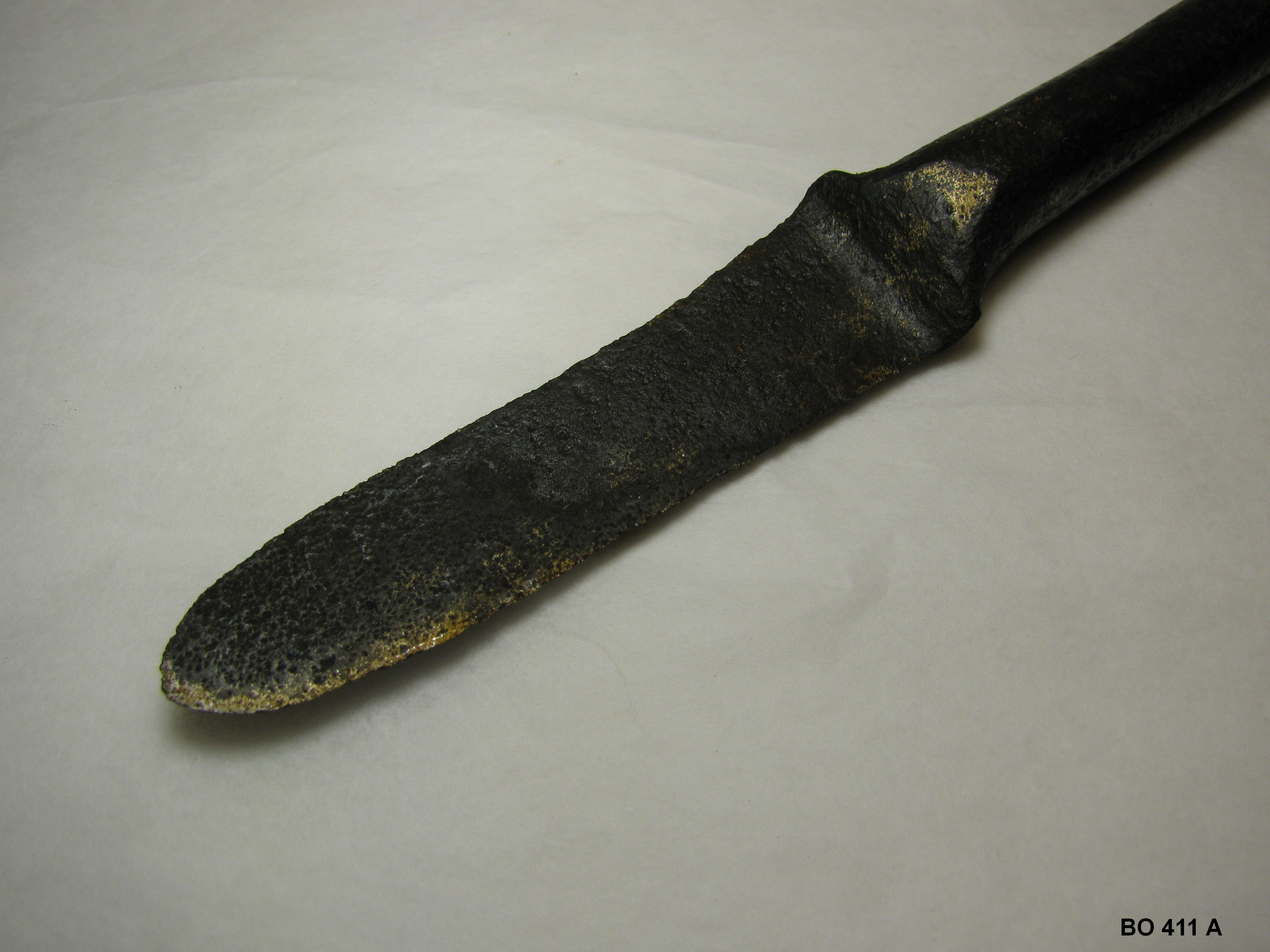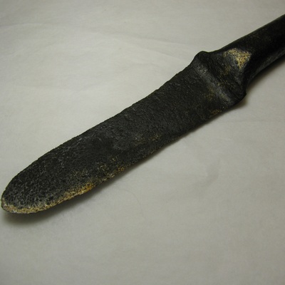Korte ijzeren steel met plat, tweezijdig snijdend mes en aan de andere zijde een vierkante steel, puntig toelopend. Zwart.