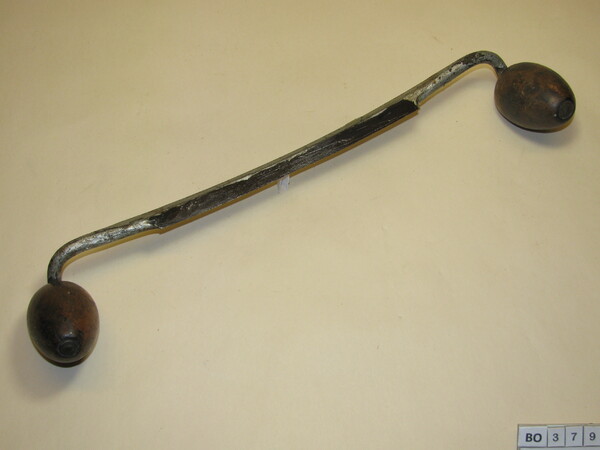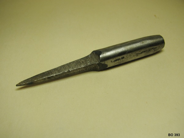 Smal mes met aan de ene kant de haak voor het blok, en aan de andere kant een brede platte steel, eindigend in punt voor het handvat (niet aanwezig). Drie rondjes bij de haak. Zwart.