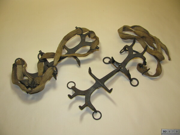Deze ijzers werden bij het vissen in de winter onder de klompen gedragen.
