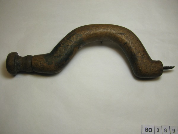 Koppelboor, Nederland, Midden 20e eeuw Kleine houten slingerboor met klein ijzeren gutsje en draaiende houten kruk. Bruin.