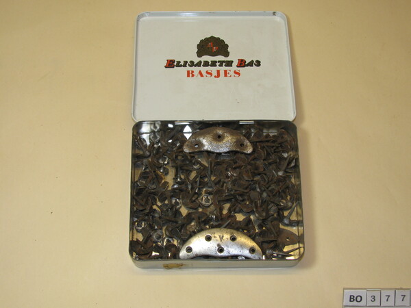 Klompenbeslag, Nederland, Midden 20e eeuw Elisabeth Bas blikken doosje met divers klompenbeslag. Blank.