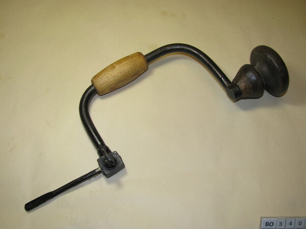Koppelboor, Frankrijk, Begin 20e eeuw Ronde ijzeren booromslag met nieuw handvat, met boven ronde houten handvat waarin omslag ronddraait. Aan de andere zijde; rechthoekig stukje ijzer met schroef waarme een boortje wordt vastgezet. Zwart, naturel.