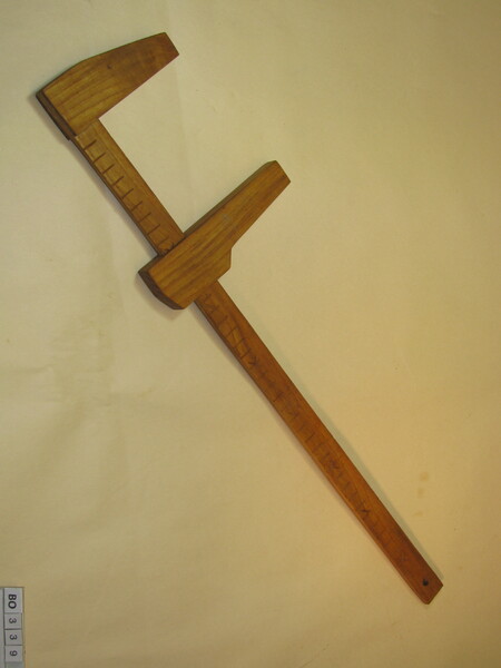 Maatstok, Nederland/Frankrijk, Midden 20e eeuw (Replica) Maatstok/schuifmaat (Pied a Coulisse). Smalle houten lat met maatverdeling in centimeters, met gat voor ophanging. Eindigend in een dwars breder stuk hout, op het latje kan een ander stuk hout heen en weer bewogen worden. Replica (Frankrijk) (door Bongers?). Bruin.