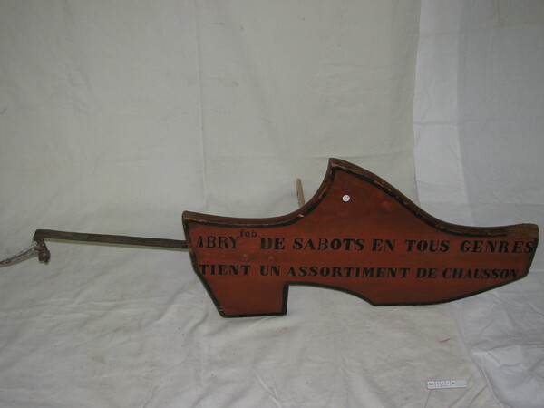 Uithangbord Klomp, Frankrijk, Eind 19e eeuw Uithangbord klomp, kapklomp, plat. Hoge hak, stompe punt. Met geschilderde tekst: Abry fab De Sabots En Tous Genres Tient Un Assortiment De Chausson. IJzeren pen. Bruin, Zwart.
