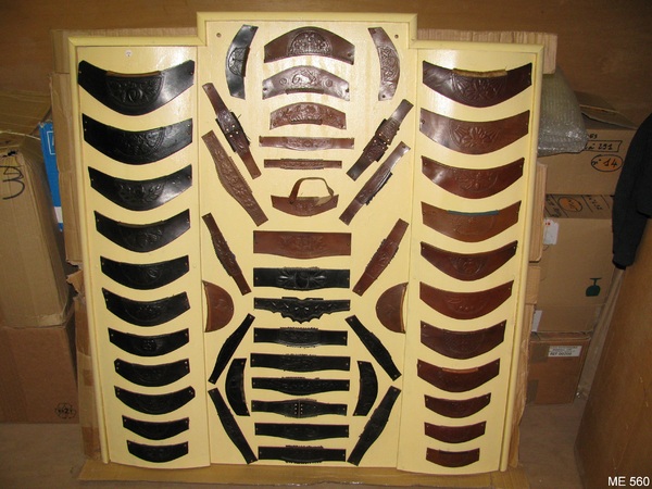 Wreefbanden, Frankrijk, Begin 20e eeuw Bord met diverse soorten wreefbanden. Bord heeft 2 ronde zijpanelen en rand. In totaal 53 wreefbanden/riemen hierop bevestigd. Geel, bruin, zwart.