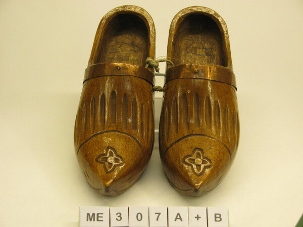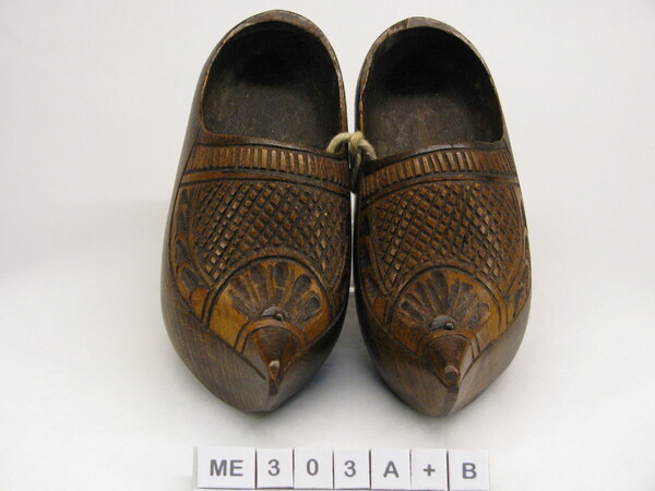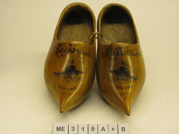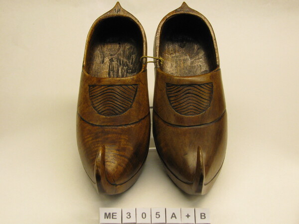 Modelklompen, half bedekt. Met leren wreefband. Spitse opgaande neus. Snijwerk op kap van bladeren, streepjes en golfjes, rand is gelobd. Tekst op zijkant: Welt krieg Bisel 1914-15. Op zool - F.Juen Noel 54. Bruin gelakt.