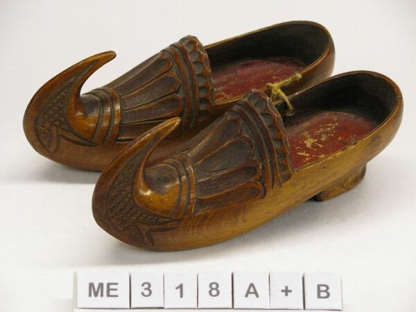 Modelklompen, Frankrijk, Eind 19e eeuw Modelklompen, kapklomp met fraai snijwerk. Sterke opgaande scherpe punt, als krul doorlopend tot boven de neus. Hoge hak.