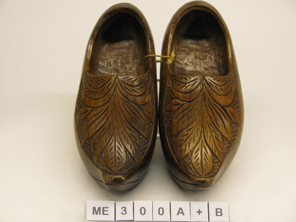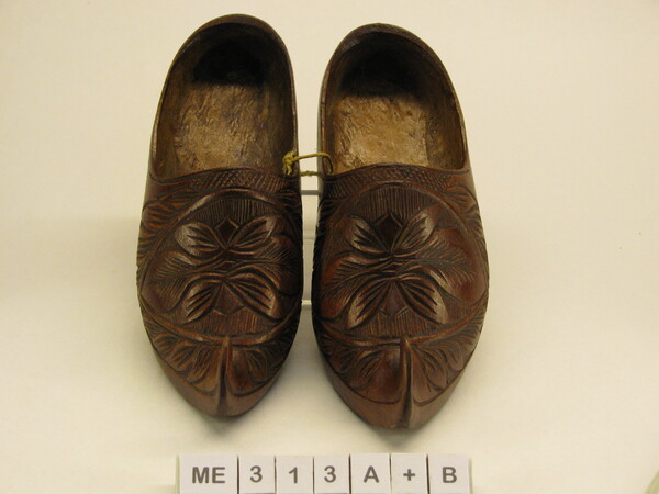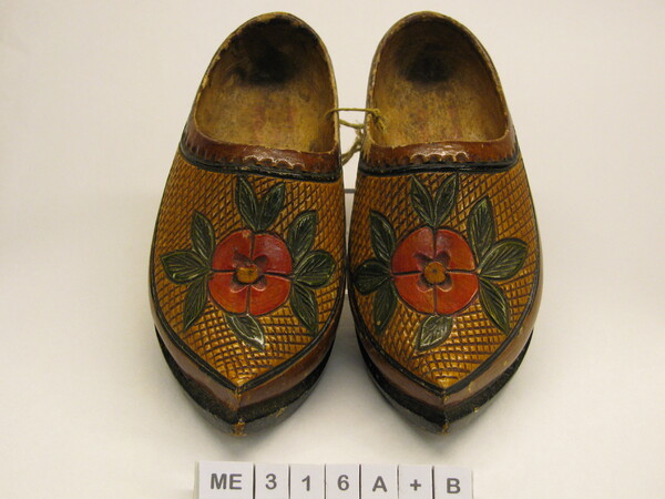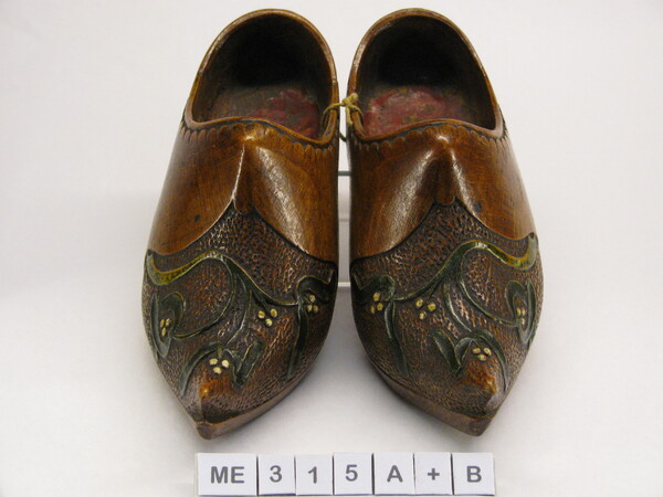 Modelklompen (kinderklompen), bedekt. Spitse opgaande neus. Snijwerk op kap op ondergrond van ruiten met vogel en bloemen met bladeren. Model als schoen imitatie, met hak. Versleten etiket op binnenzool. Bruin, zwart, rood.