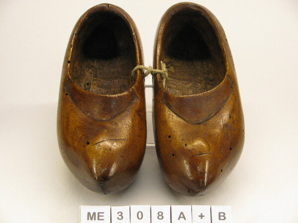 Modelklompen, Frankrijk, Eind 19e eeuw Modelklompen (kinderklompen), bedekt. Stompe iets opgaande neus. Snijwerk op kap van medaillon/bloem met letters T (op A) en B (op B). Verder streepversiering en schubjes/lobjes langs rand. Lage hak. Donker bruin gelakt.