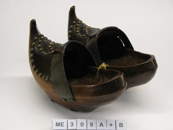 Souvenirklompen, Frankrijk, Begin 20e eeuw Souvenirklompen, model bethmale, bootmodel. Brede blikken wreefband. Hoge opgaande punt, leren kap. Messing nagels op de kap -> bloemetje. Bruin.