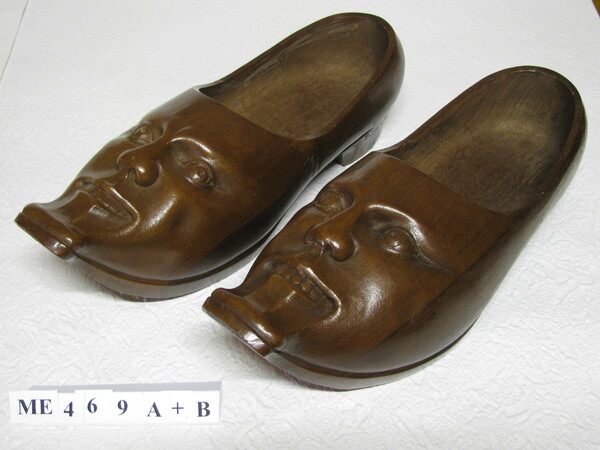 Modelklompen, Frankrijk, Midden 20e eeuw Sierklomp met houtsnijwerk. Klompen met brede kin punt zonder bride. Gelijke beeldtenissen van gezicht. Met hak. Half open/gesloten. Gelakte sierklomp met gezichtsvoorstelling en opgaande kin als brede punt en zool simulatie. Niet gedragen, enige slijtage.