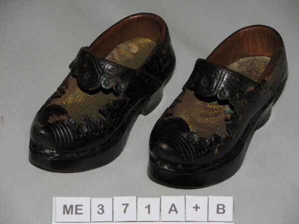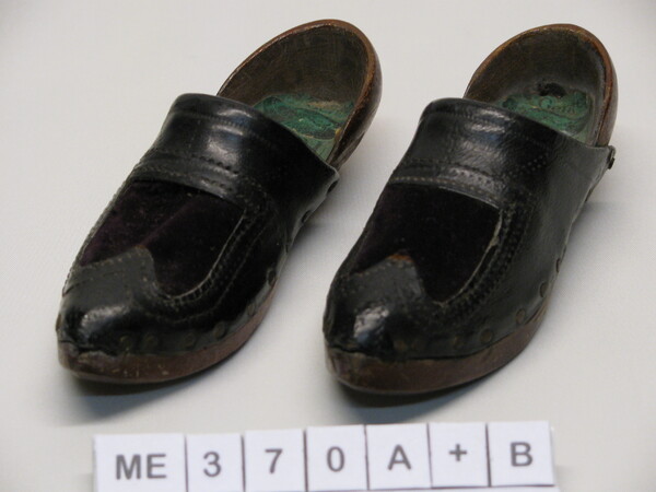 Modelgaloches, Frankrijk, 20e eeuw Modelklomp (miniatuurklompen). Galoche in miniatuur model. Hoog model, open gewerkt leer. Hoge hak. Binnenzooltjes leer (of papier) met polychroom, goud, bloemen. Puntjes neus. Hoge hiel. Leer op kap gestanste versiering. Binnenzijde hiel extra leer naar binnen gevouwen. Zwart gelakt. Goud - rood - groen.