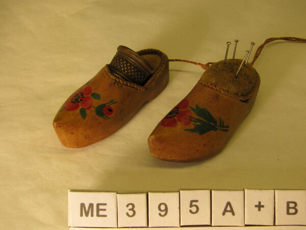 Klompjes met naaigerei, Frankrijk, 20e eeuw Twee kapklompjes met gewerfde bloemversiering aan een koortje met elkaar verbonden. In A: vinger houdje, in B: kussentje met vier speldjes. Kleur: Blank, groe en rood.