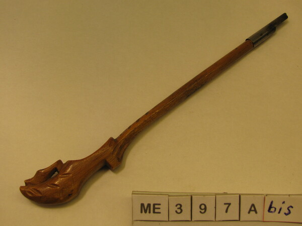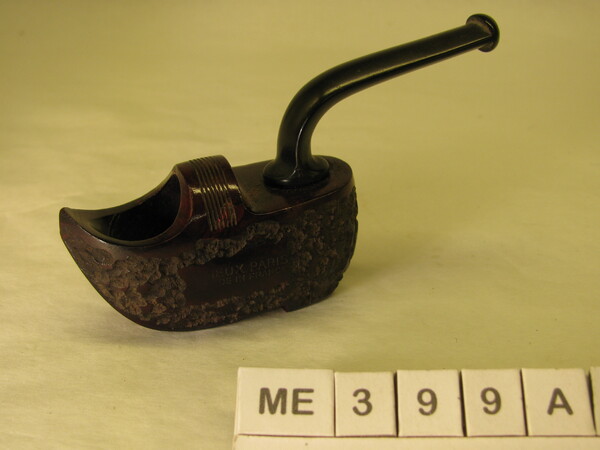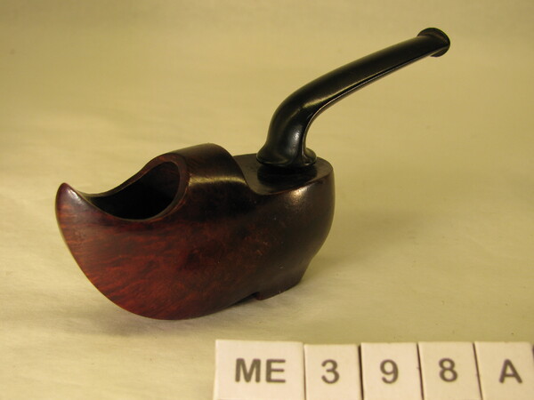 Pijp met klompje, Frankrijk, Begin 20e eeuw Pijp met kop in vorm van klomp, bedekt, opgaande spitse neus uitlopend in punt, met hak. Steel lang en hoekig met steun puntjes, die afgebroken zijn.. Bochtig mond, stuk, met schroefdraad eraangezet met ivoren draad. Koperen bandjes aan begin + eind van steel. Kleur: Blank gelakt, zwart. Ca. 1925.