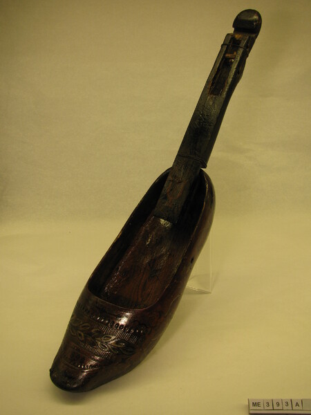 Klompviool, Frankrijk, Eind 19e eeuw Kapklomp, half gedekt, brede opgaande neus, lage hak. Ritsversiering op de kap: streepjes, blaadjes, karteltjes. De zijden hebben gewerfde bloem versiering. Aan de achterzijde is de hals van de viool bevestigd. Versierd met lier. Niet compleet. Kleur: Bruin, groen en goud.