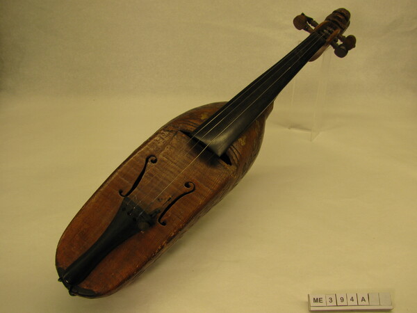Klompviool, Frankrijk, Begin 20e eeuw Gesloten klomp, dient als klankkast, neus is verlengd als hals van de viool eindigend in een apenkop (uitgesneden). Vier snarren met spanknoppen. Ritsversiering: bladeren. Op onderzijde: afbeelding kasteel met raampjes van parelmoer. Op de hak: de zon. Kleur: Bruin en zwart.