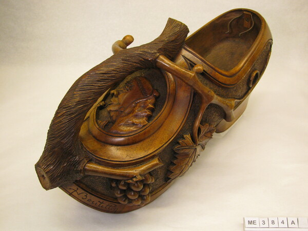 Wijnfleshouder, Frankrijk, 20e eeuw Kapklomp, hoge hak, opgaande punt, op de kap een druiventak als handvat met zijtakken met bladeren en druiventrossen: sculpturen ook midden op de kap: mannenkop met fles. Tekst: Boutillion. Bijz. : in de hak zit een speeldoosje ! Kleur: Bruin.