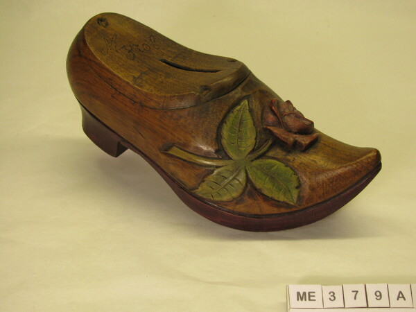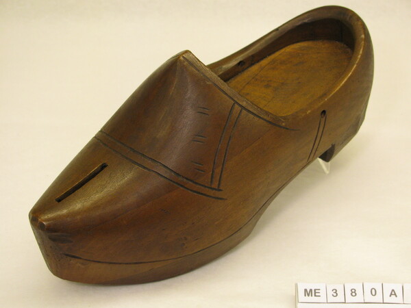 Spaarpot Klomp, Frankrijk, 20e eeuw Spaarpot in vorm van klomp. Bedekt. Opgaande iets stompe neus met 4 cm hoogte. Op de kap ritslijn van schoenimitatie op de wreef. met hak. Spaargleuf op de neus. Leeg haakbakje onder de hak met schuifsysteem. Afdichting van de bek ondersteund door balkjes binnenin. Hoge spitse wreef. Kleur: Blank gelakt.