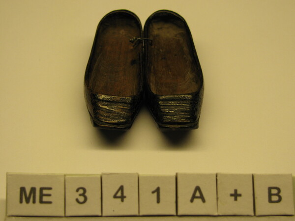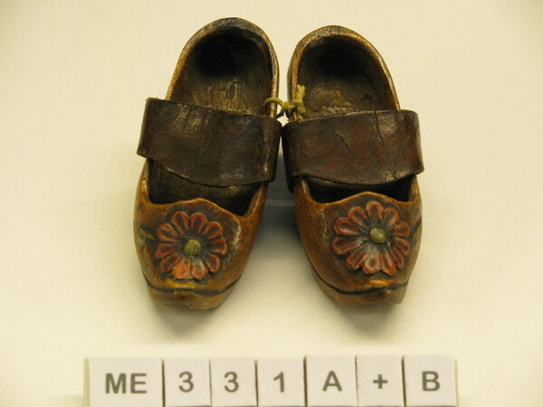 Kleine modelklompen. Half bedekt. Brede opgaande neus. Leren wreefbanden. Met hakje. (Linkerkap bij wreef beschadigd.) Kleur: bruin-zwart leer