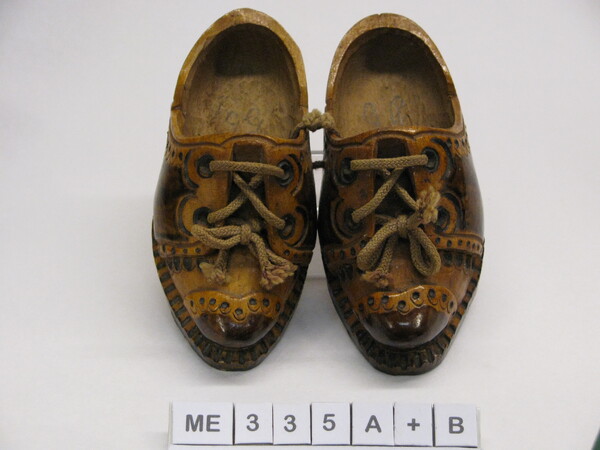 Modelklompen, Frankrijk, Begin 20e eeuw Modelklompen, bedekt, stompe neus, schoenimitatie door duidelijk opgezette leerstukken bij veters en neus. Met echte veters door gepriemde gaten. Bruine verf, simuleert lakschoenen. Zijkant gelobd. Met hak.