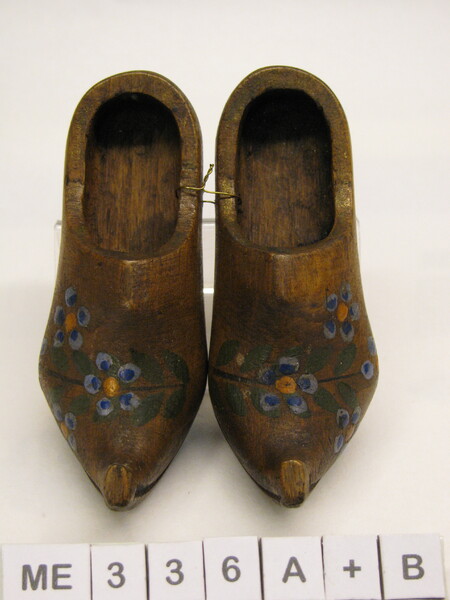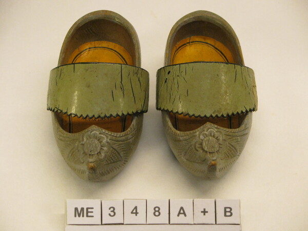 Modelklompen, Frankrijk, Begin 20e eeuw Modelklompen, bedekt. Met puntige wreef en omhooggaande puntige neus. Op kap schildering van 4 bloemetjes en takjes (vergeet-me-nietjes?). Zool imitatie, lage hak. Blank gelakt, donker- en lichtblauw, groen.