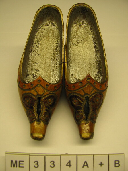 Modelklompen, Frankrijk, Begin 20e eeuw Modelklompen, half bedekt. Iets brede opgaande neus. Gravure van vlinder op kap met band en stippen langs insteek. Zwarte zool. Zilverkleurige zool. Gouden neus. Lage hak. Hiel steekt naar achteren.