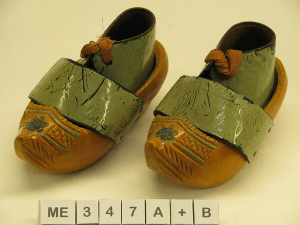 Modelklompen, Frankrijk, Eind 19de eeuw Kleine modelklompen. Half bedekt. Brede iets opgaande neus. Kap heeft kreukel-leer imitatie. Met hak en lage hiel.
